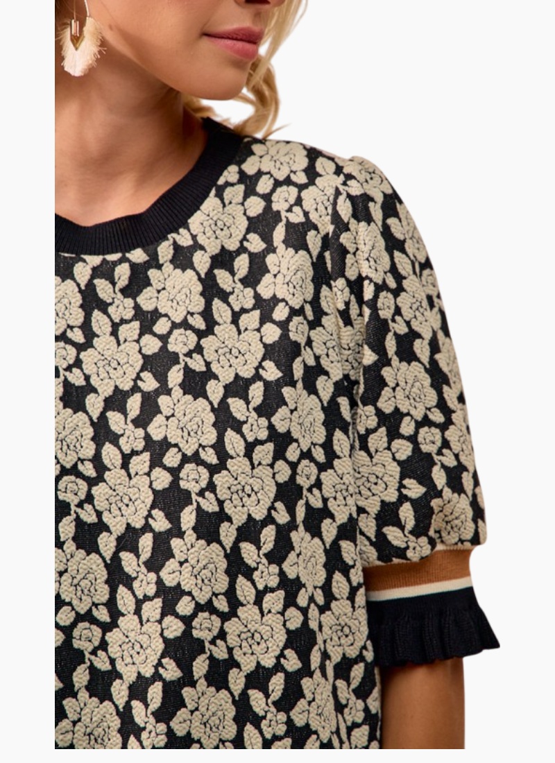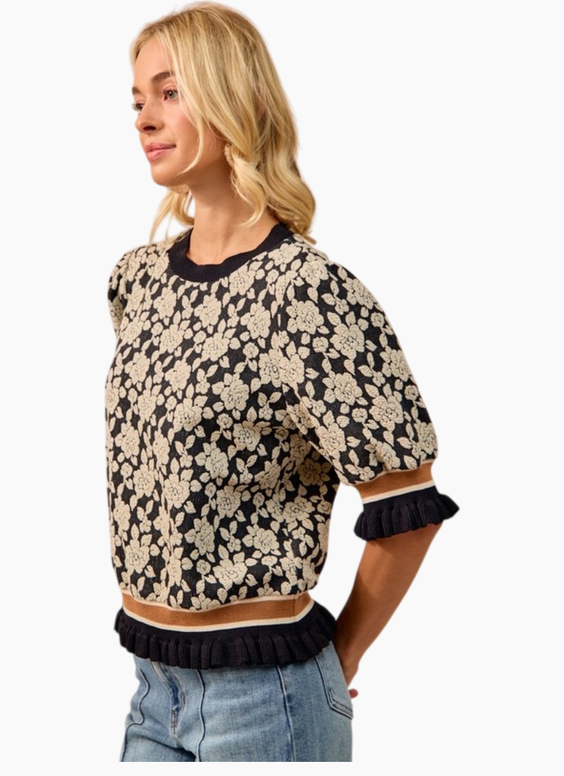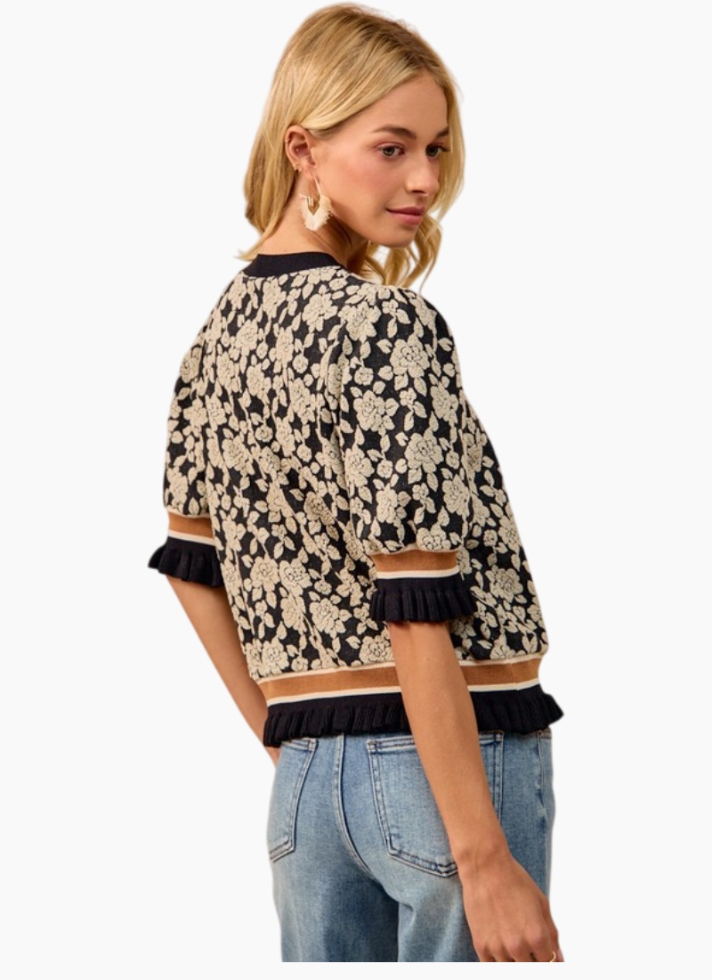 Textured short sleeve sweater with puff sleeves detailed with contrast bands.