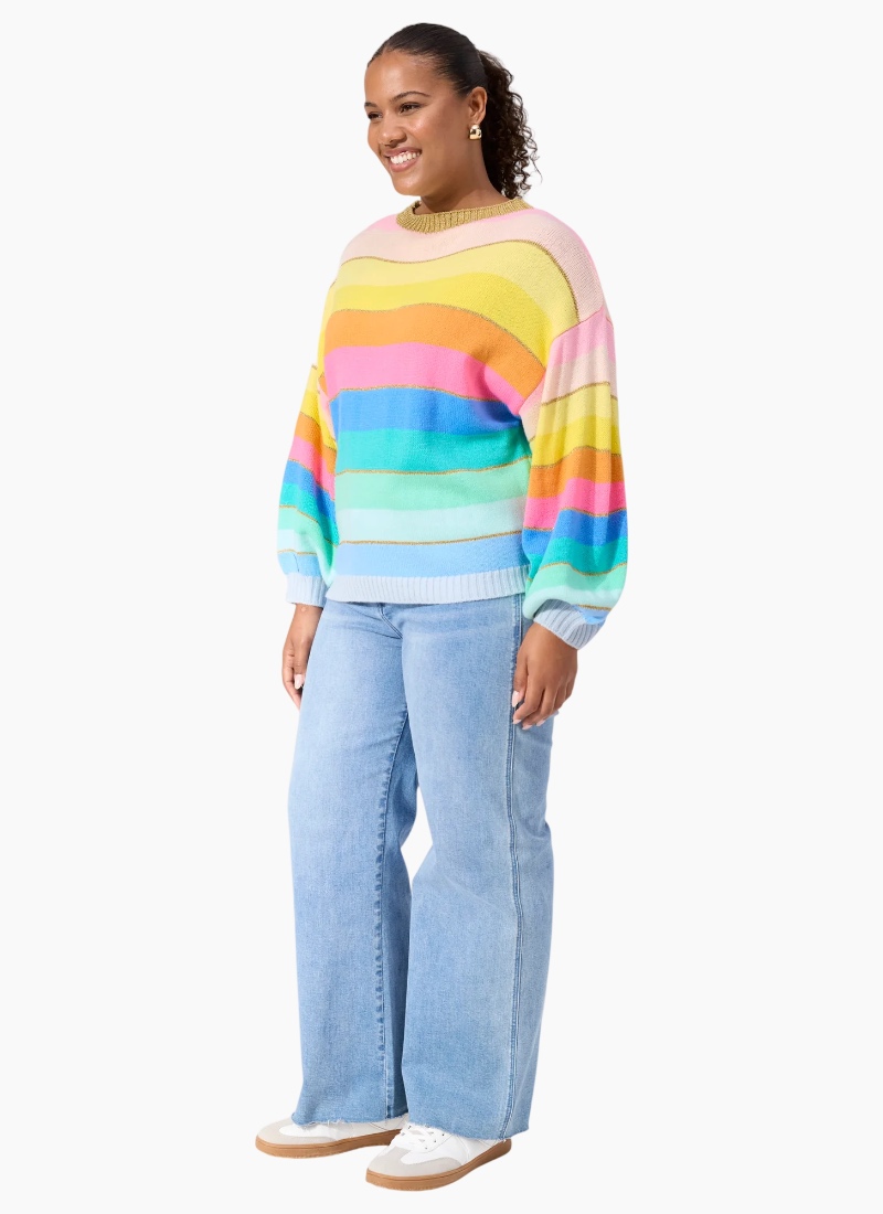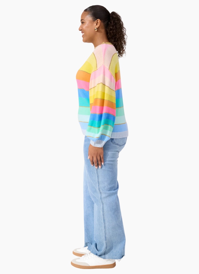 Niseko Jumper A feel-good knit designed to bring colour to cooler days, the Niseko Jumper features a custom multicolour stripe design with fine sparkle threading woven throughout the knit. Soft, relaxed and easy to wear, it’s an effortless way to add interest to everyday dressing. Style it with classic denim for a casual pop of colour, or layer under a clean oversized coat on cooler days. An easy statement piece that lifts simple outfits without feeling overdone. Features Boat neckline with sparkle knit detail Relaxed drop shoulder shape Long balloon sleeves Custom multicolour stripe design Lurex threading throughout for subtle shimmer