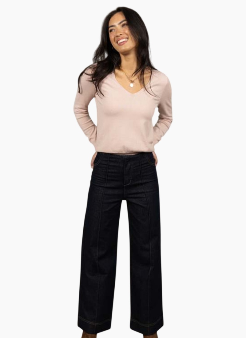 A returning best-selling basic. The Hanna Jumper is your go-to knit for effortless layering or easy everyday wear. Crafted from a silky-soft fibre blend, it features a clean V-neck and flattering slim fit that works tucked or untucked. Lightweight, breathable and beautifully soft on the skin. This is one of those wear-on-repeat pieces you’ll love across all seasons. We’ve paired Hanna with our jeans for a simple yet stylish look you’ll reach for repeatedly. • Flattering, slimline v-neck jumper. • Lightweight and breathable, but very warm – the perfect layering piece. • Comfortable V-neck design that doesn’t cut too low. • Full-length sleeves with fine ribbed cuffs. • Gently shaped through the body with ribbed detail at the hem and neckline. • Sits just above the hip on average height. • Wear as a layer, or individually.