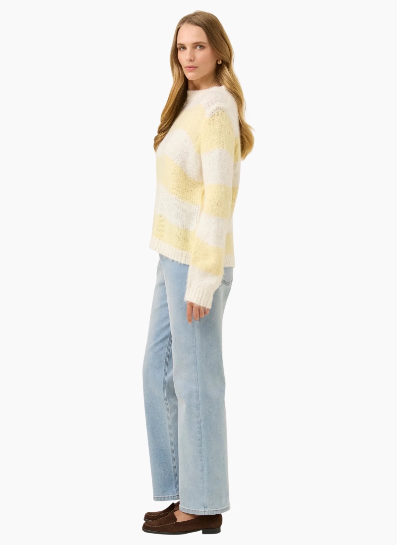 Soft, fluffy, and light to wear, the Pallas Stripe Jumper brings a bright pop of colour to your cool-weather wardrobe. Designed with a playful colour-block stripe, it adds warmth and personality while keeping the silhouette relaxed and easy to style. The loosely knitted texture creates a soft, cosy feel without being heavy, while the classic crew neckline keeps the look timeless and versatile. Perfect for layering over your favourite cotton basics or pairing with denim for effortless everyday comfort. Features Colour-block stripe design Classic round crew neckline Soft, fluffy knit texture Lightweight yet cosy feel Relaxed, easy-to-wear style