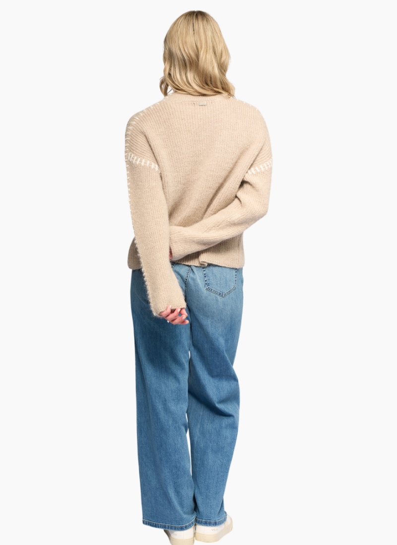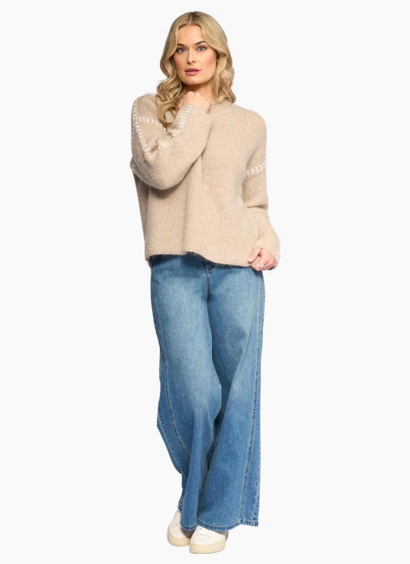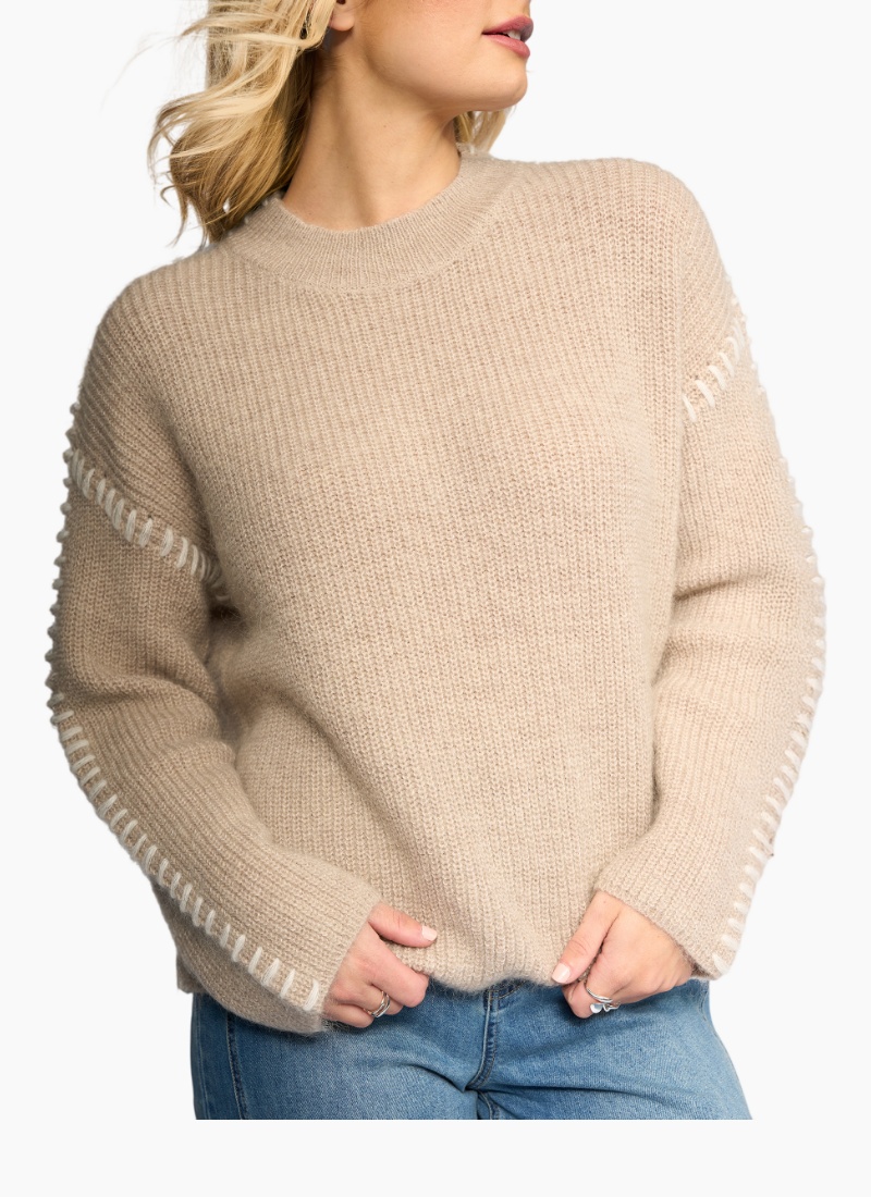 Relaxed-fit knit sweater in Oat with contrast Winter White stitching features. Made from a soft blend including mohair and wool, it features drop shoulder long sleeves and a round neckline.