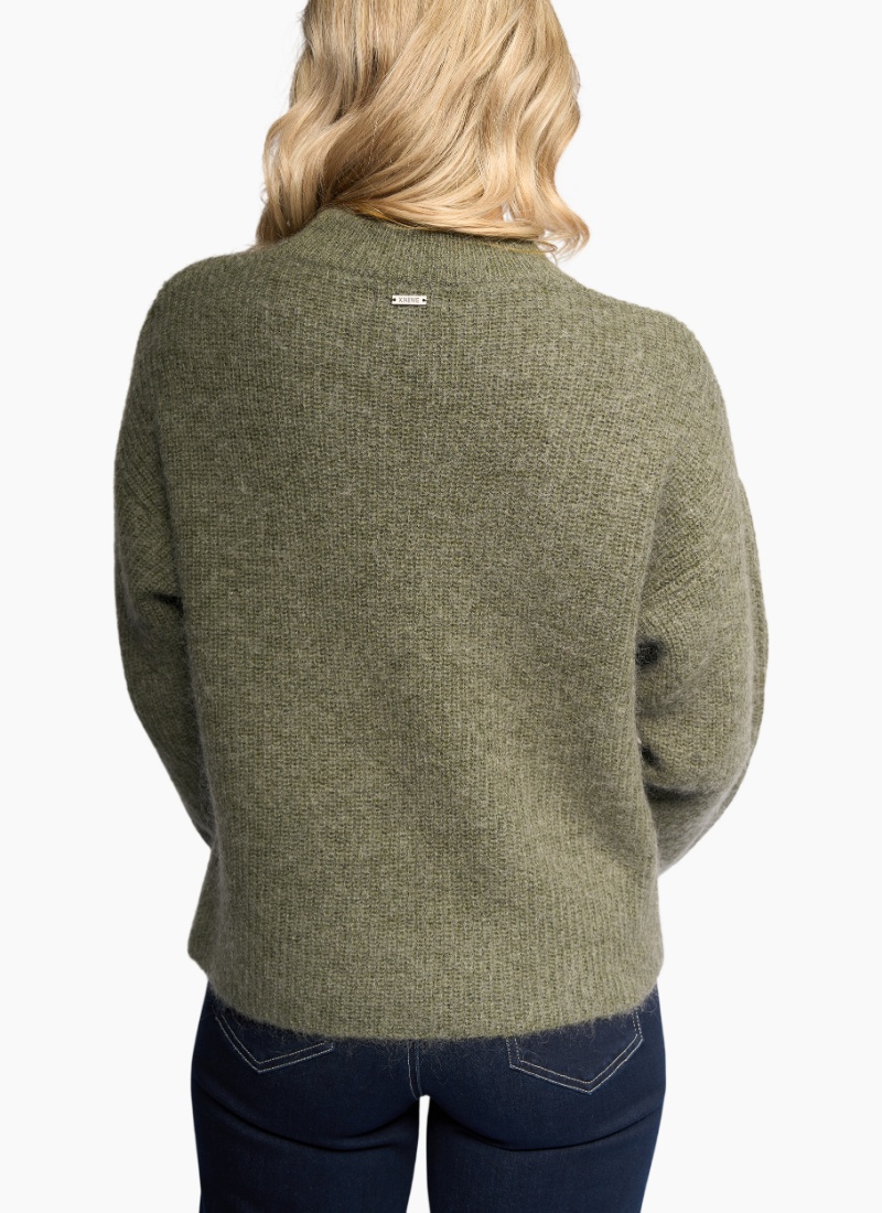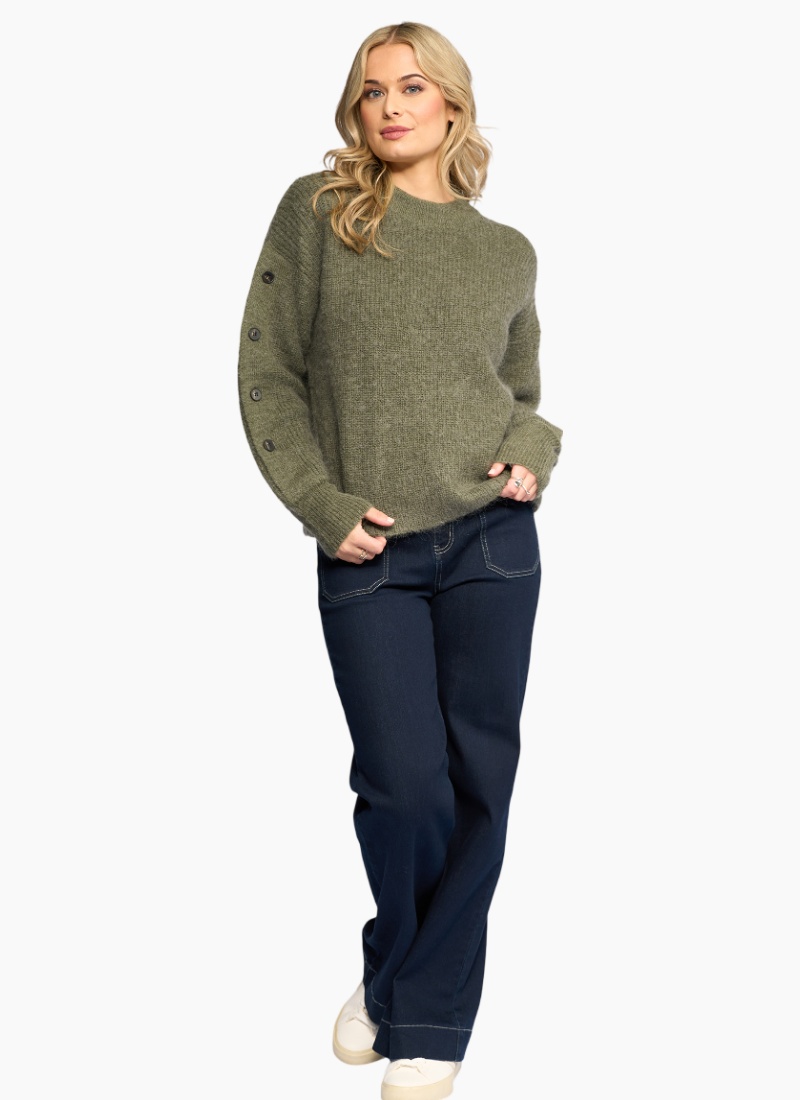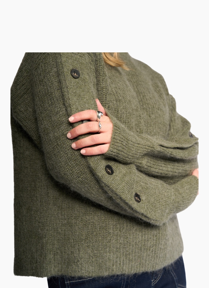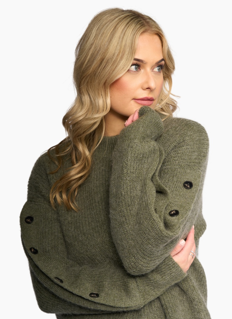Relaxed-fit knit sweater in Elm, a green colour, made from a soft blendincluding mohair and wool. Featuring a round neckline, this sweater’s standout design is its buttoned split sleeves, fastened with four black buttons and finished with softly ribbed cuffs. 40% Nylon 25% Mohair 20% Wool 15% Acrylic • Relaxed fit knit • Round neckline with metal 'KNEWE' brand plate at centre back • Long sleeves with split detail, fastened with four black marbled buttons • Relaxed fit • Model wears size 10