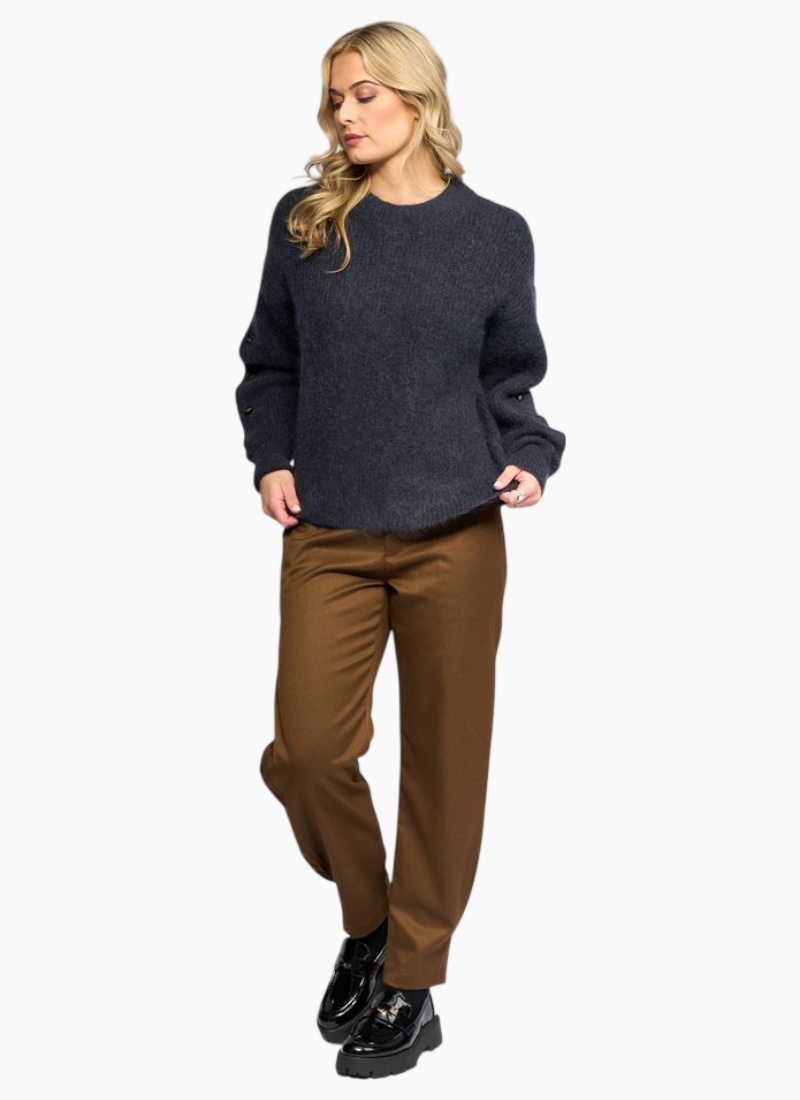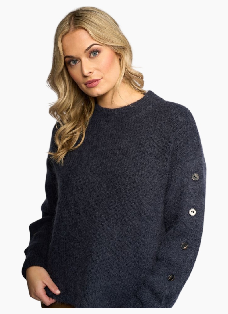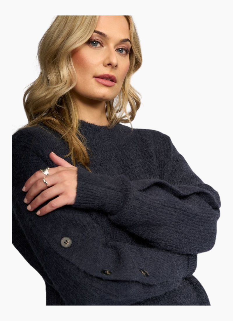 - Classic crew neck and ribbed trims with statement button detailing along the sleeve for modern interest