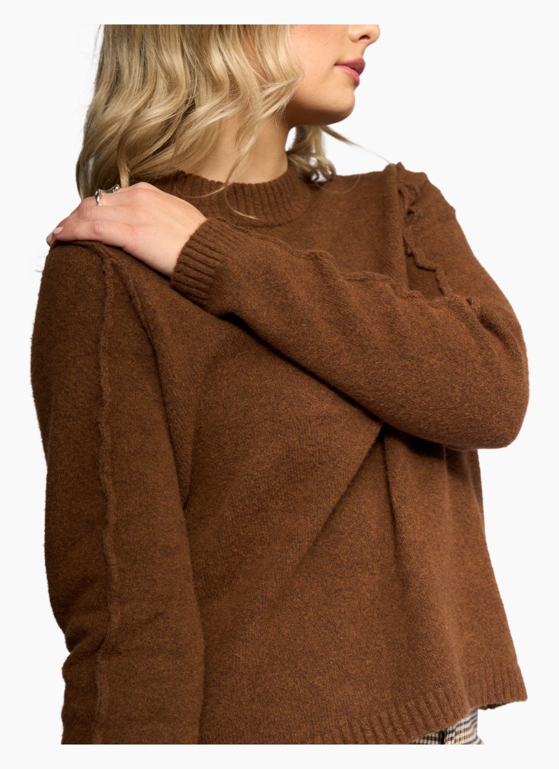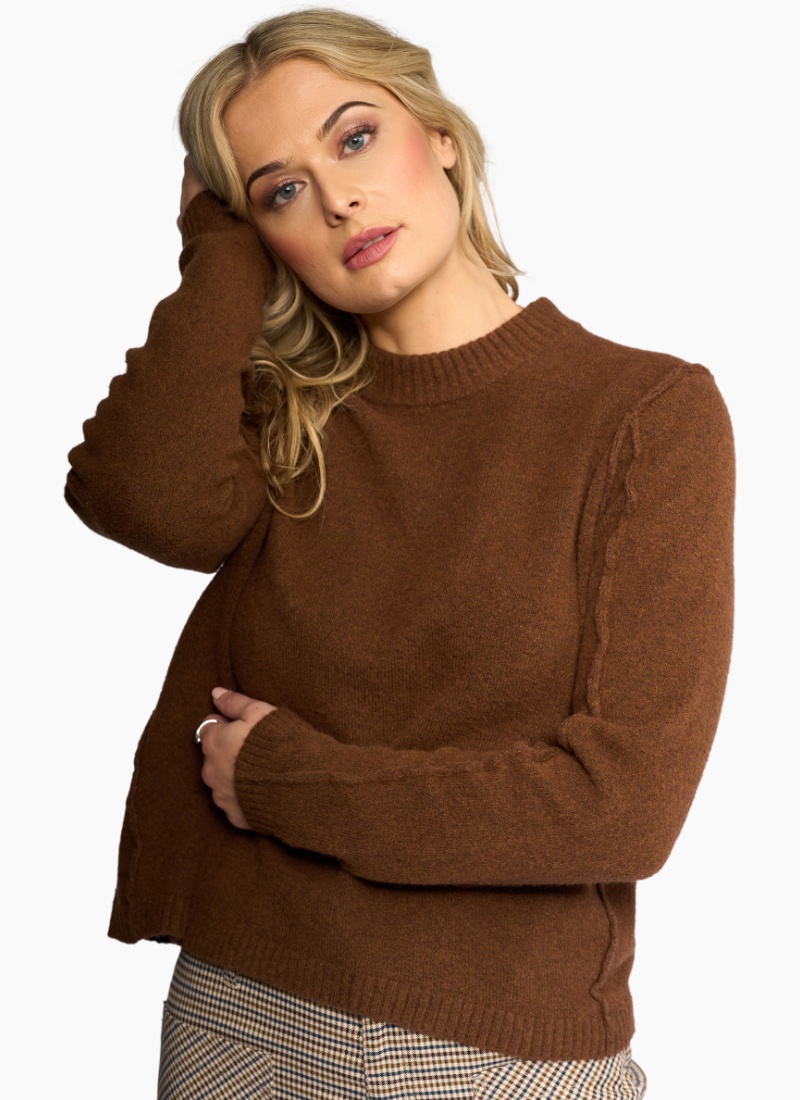 Cosy, stretchy knit sweater in Cedar, a warm, golden-brown colour. Featuring a round neckline and ribbed cuffs and hem, this sweater is defined by its exposed seam detailing along the shoulders, sleeves, and body.• Stretchy staple cotton blend knit • Ribbed round neckline, cuffs, and hem • Exposed seam detailing along shoulders, sleeves, and body • Long sleeves • Relaxed fit • Model wears size 10 62% Staple Cotton 35% Nylon 3% Elastane