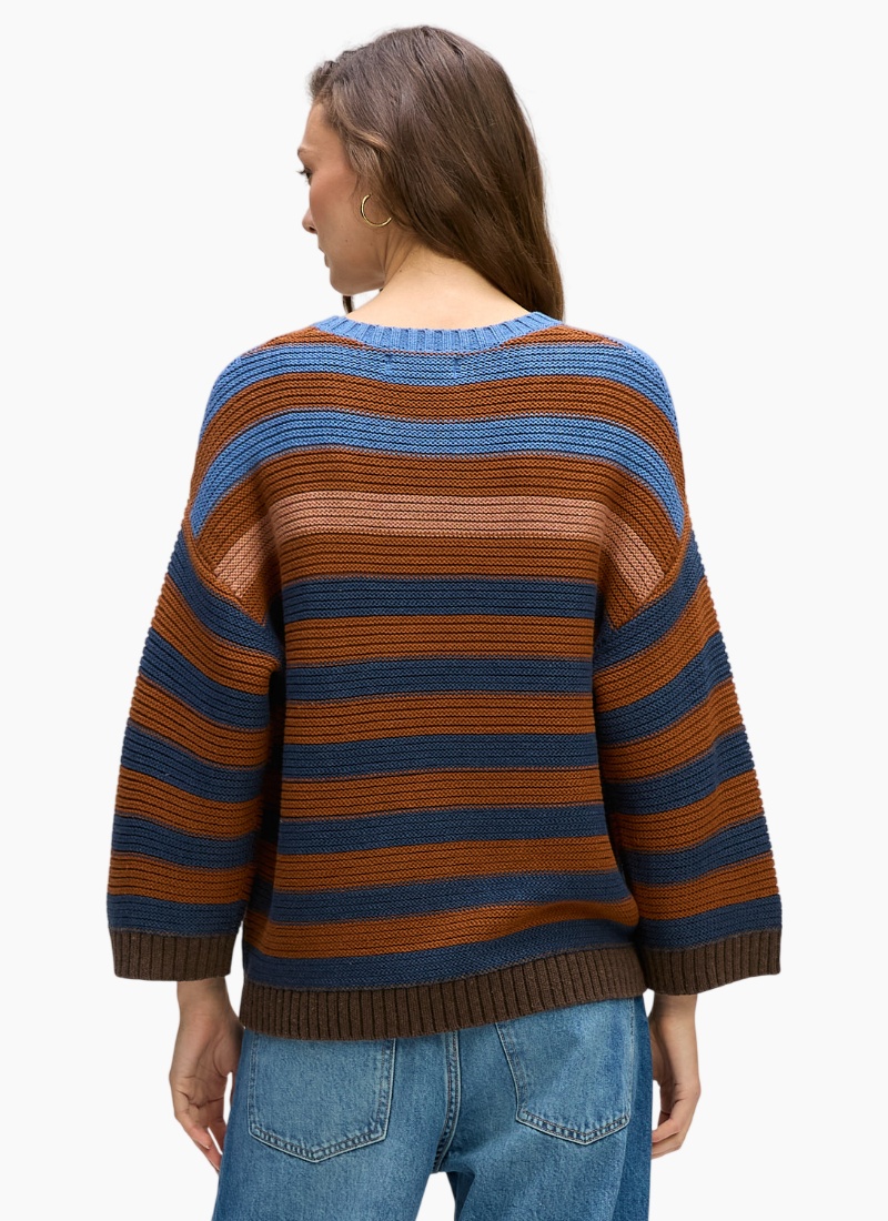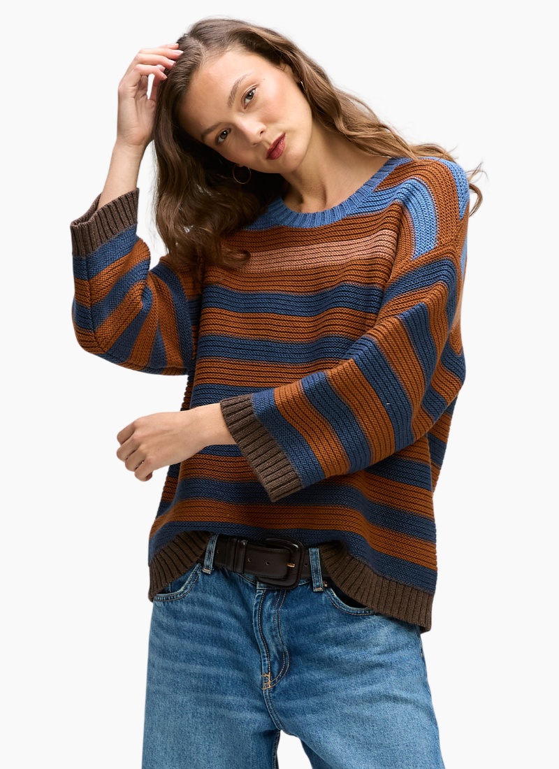 - Bold brown and blue stripes with a classic crew neckline and ribbed cuffs and hem