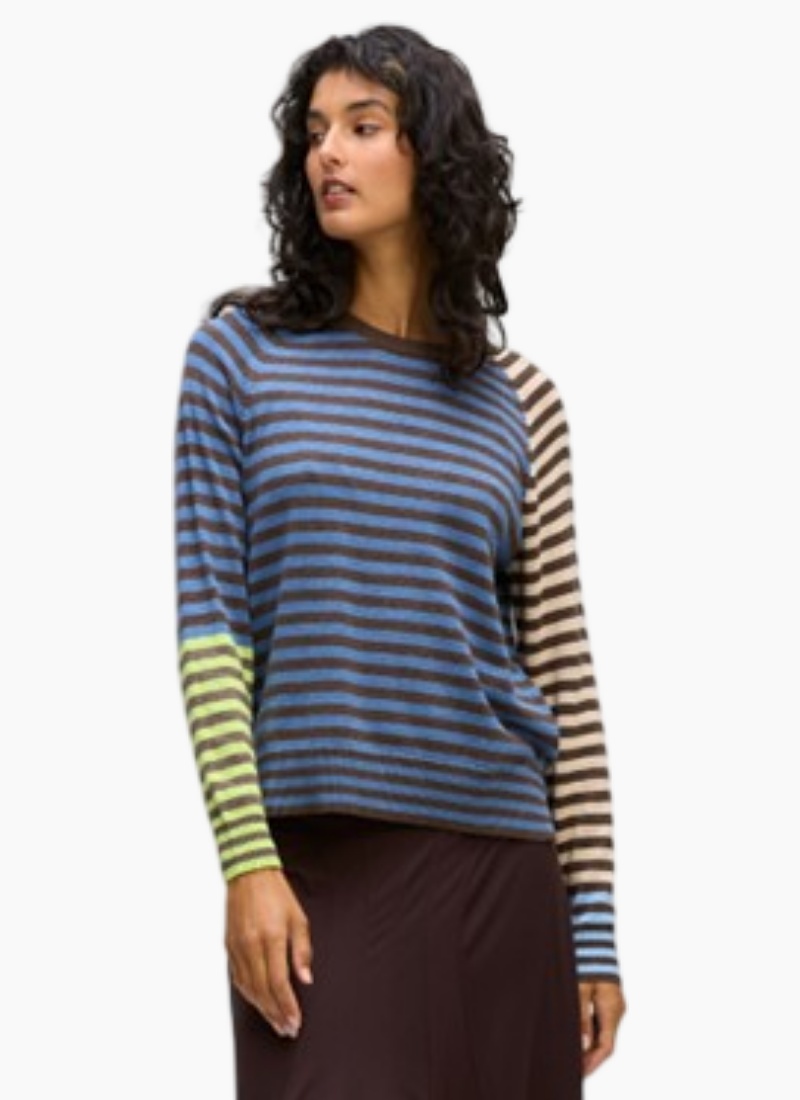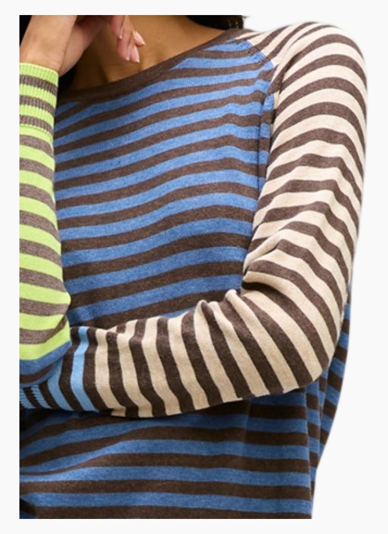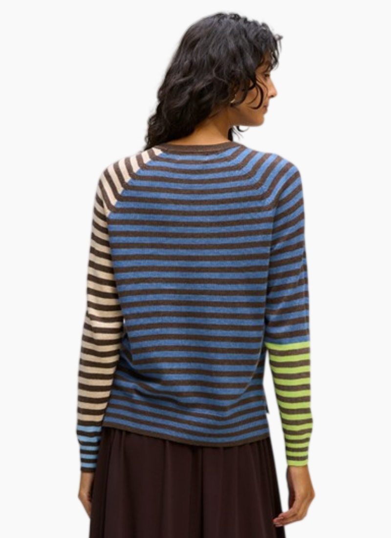 - Distinctive horizontal banded stripes in blue, cream and lime add a playful contrast to the brown colourway