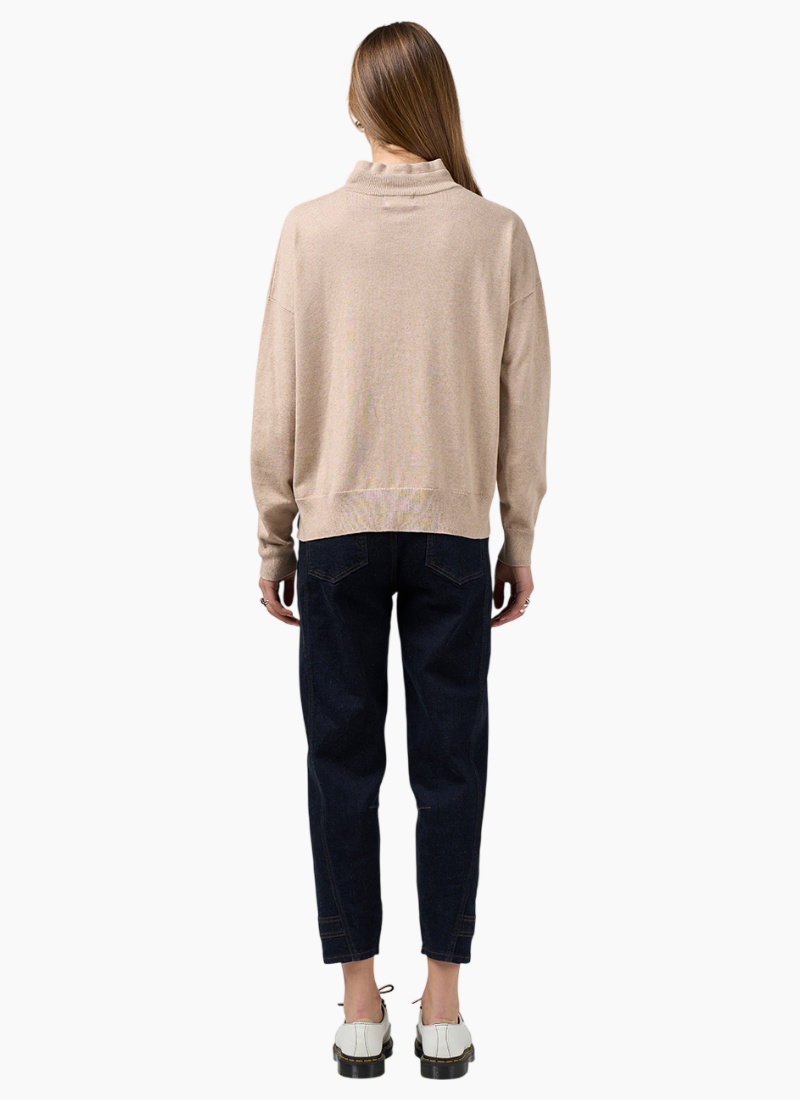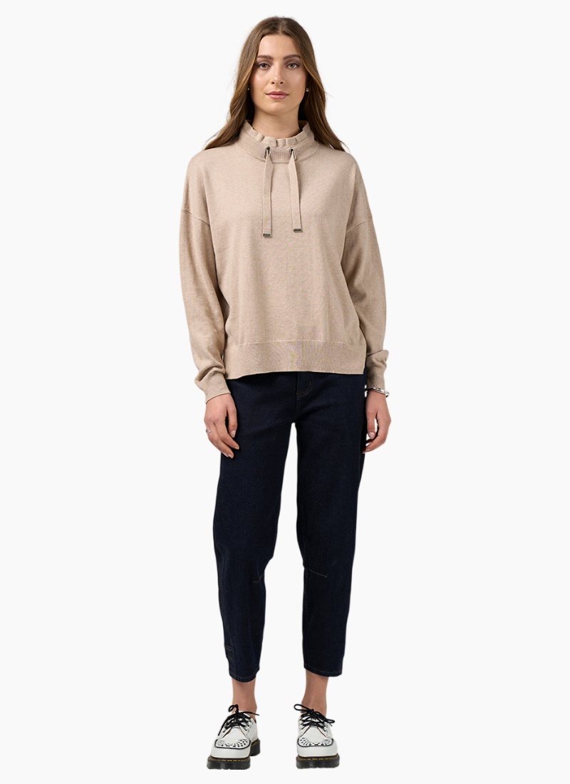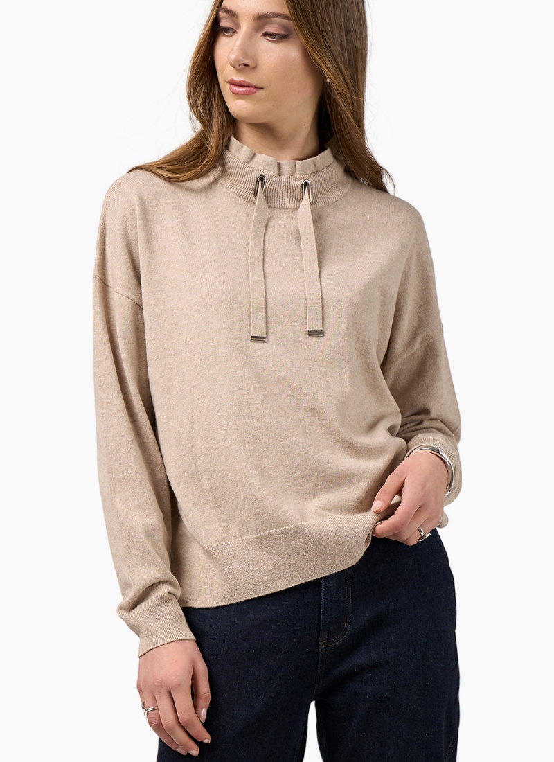 High neck sweater in a soft cotton-cashmere, with a dropped shoulder and a drawstring collar, Featuring ribbing detail around neckline, cuffs and hem.