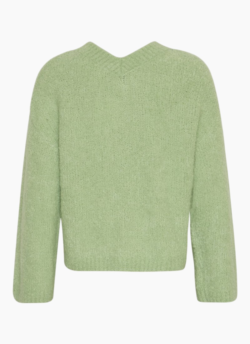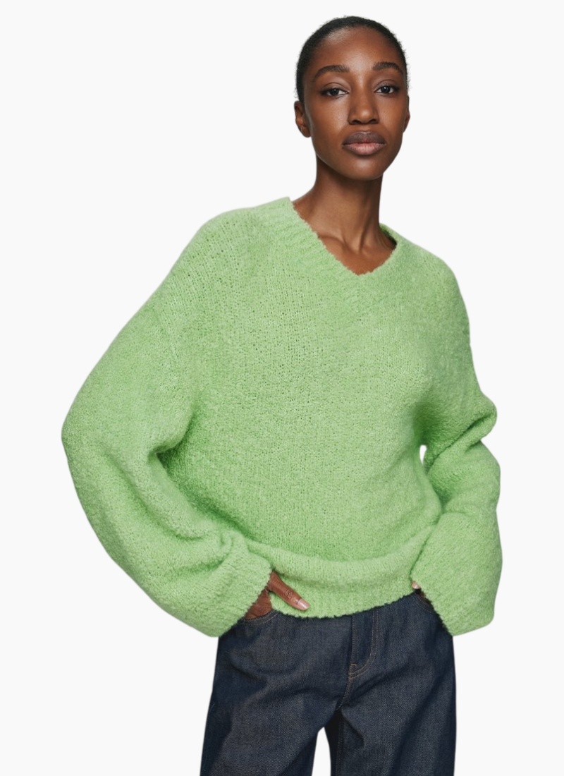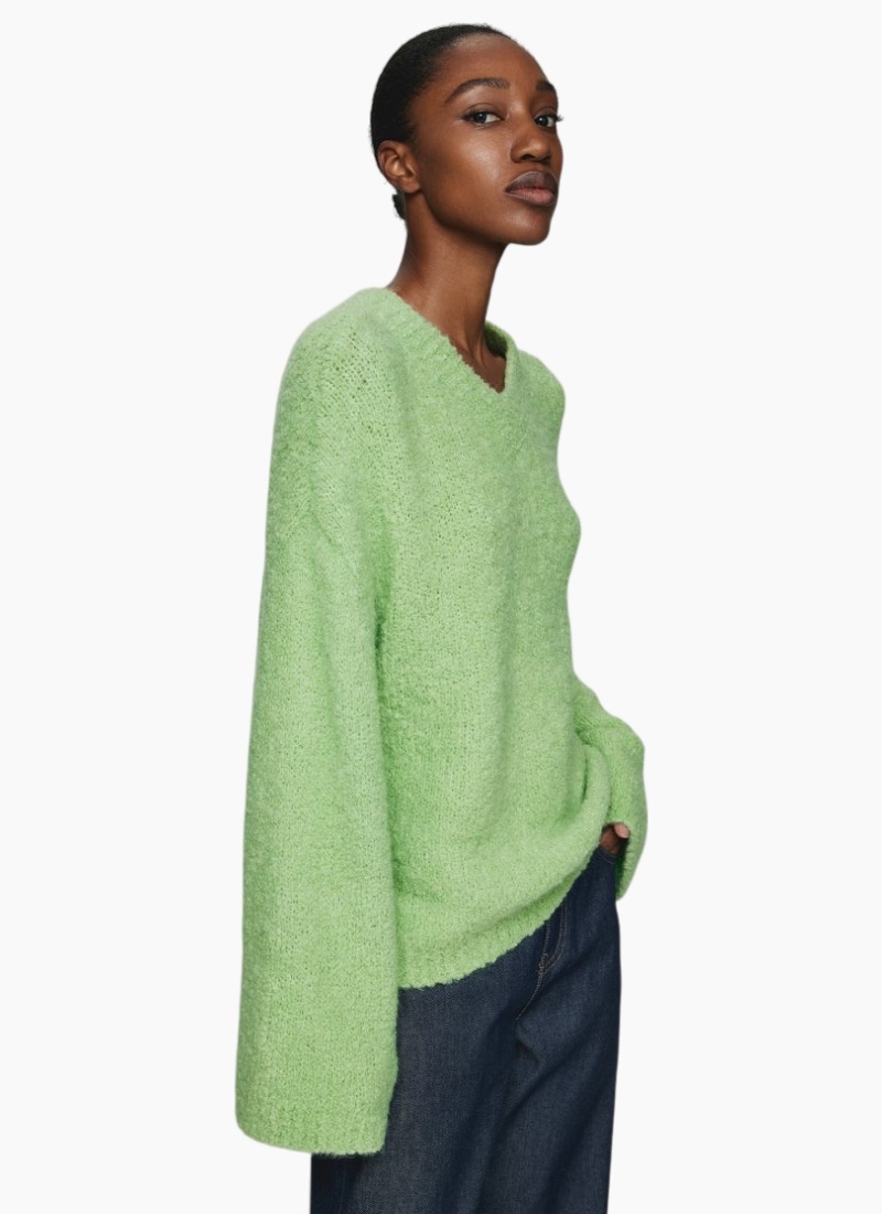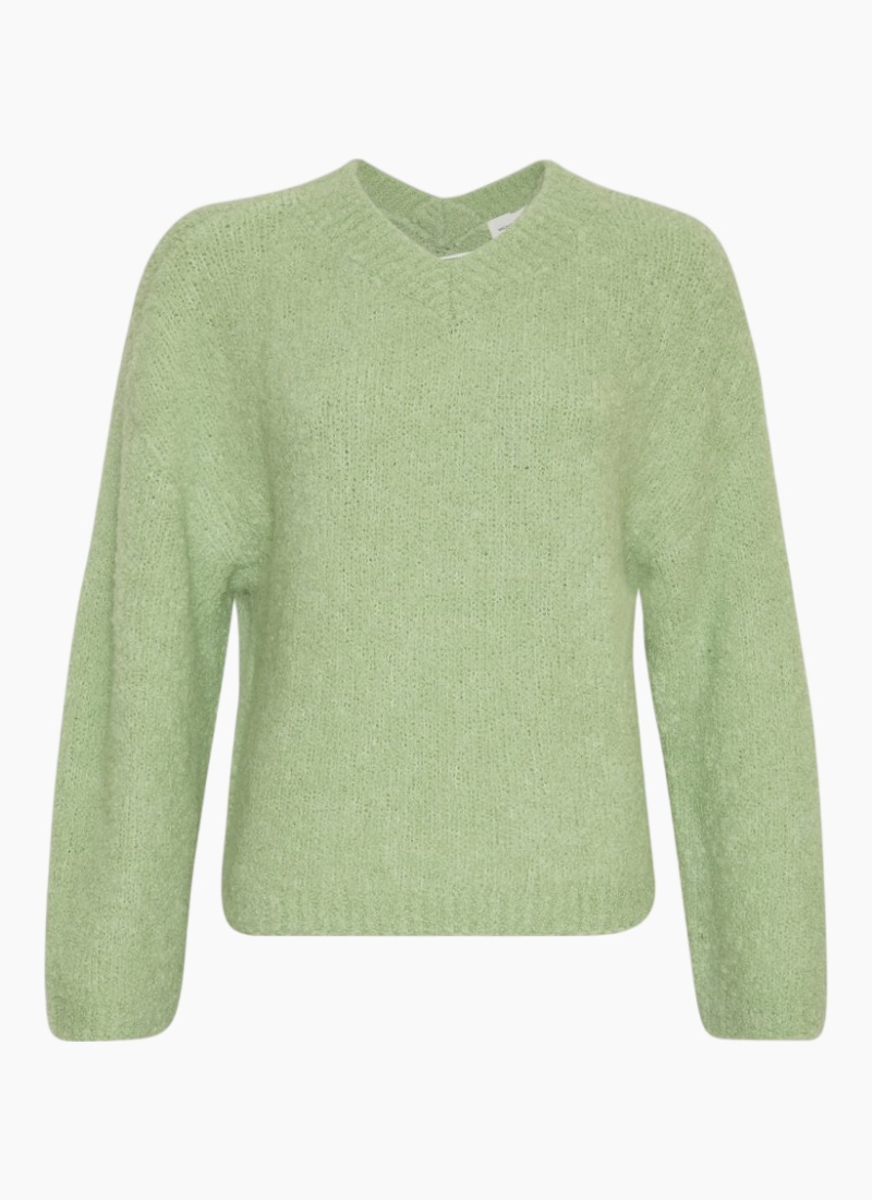 This pullover has a loose fit. The model is 173cm and wears a size S/MJilda is a pullover knitted with bucle yarn that gives the pullover some character. The pullover has a v-cut neckline and dropped shoulders that gives the illusion of it being oversized. Fitting This pullover has a loose fit. The model is 173cm and wears a size S/M. Composition 36% Wool, 35% Acrylic, 15% Alpaca, 13% Polyamide & 1% Elastane.