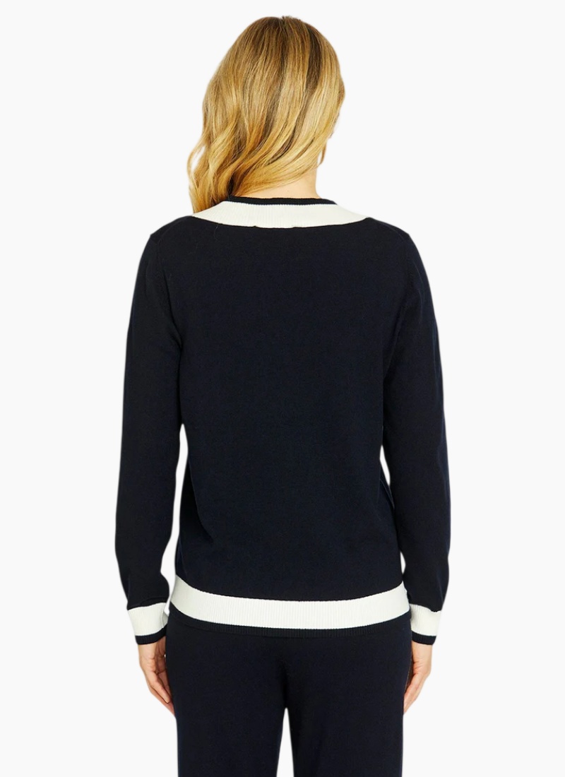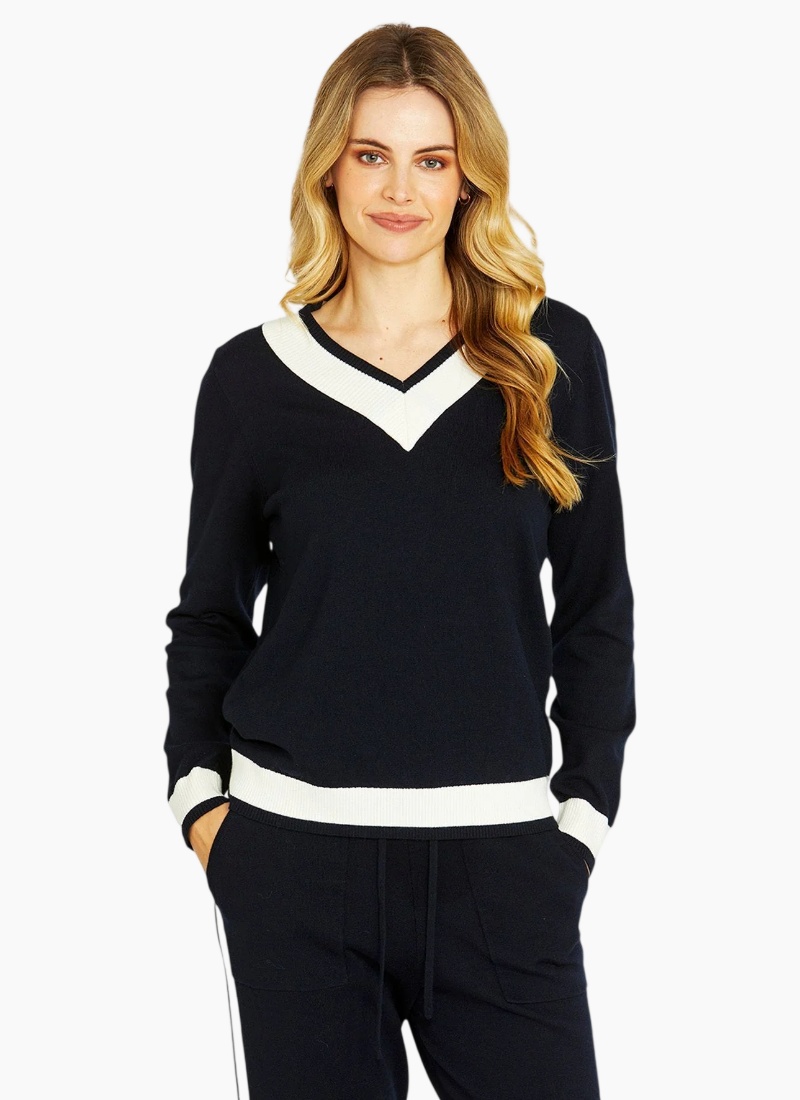 The Taylor V-Neck Pullover brings effortless style and comfort to everyday dressing. Crafted in a soft cotton-wool blend, it features a flattering V-neckline framed with a contrast panel for a modern touch. Coordinated contrast detailing at the hem and cuffs adds refined interest, while the relaxed fit makes it perfect for layering through the season. A timeless knit with elevated detailing.