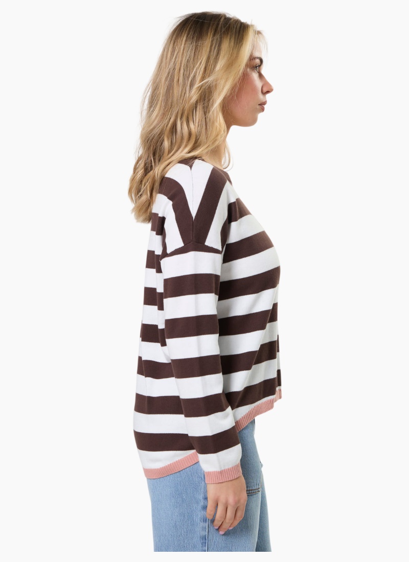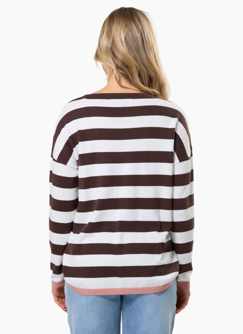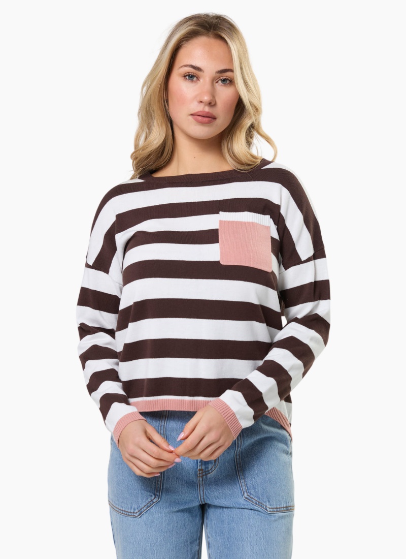 Striped lightweight jersey knit with contrast colour trims. Crew neck, chest pocket, dropped shoulder and slightly hi lo hemline.