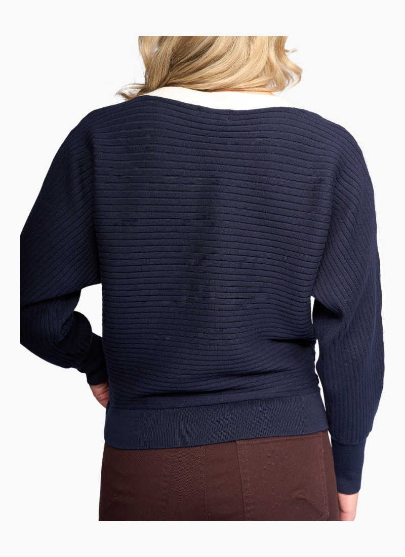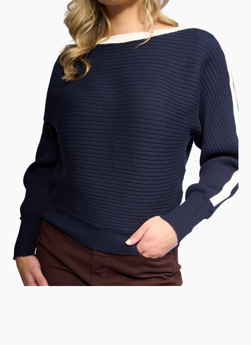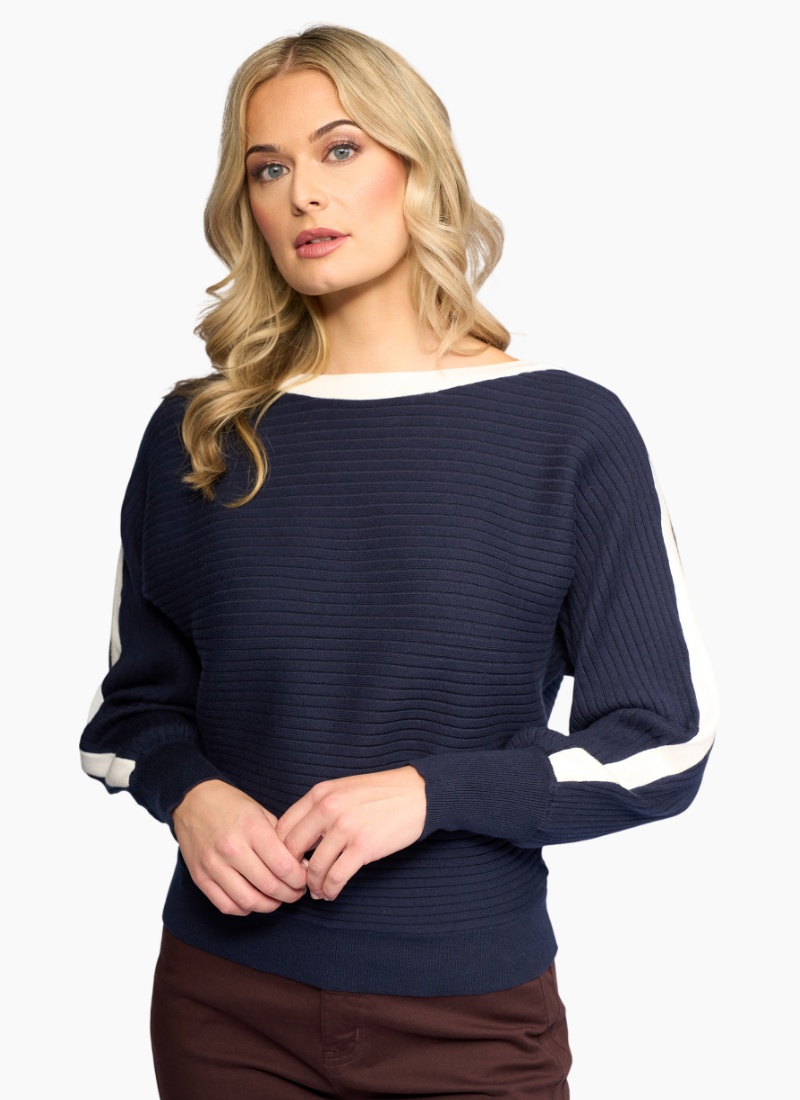 A soft batwing-sleeve sweater in our Ink/Winter White colourway — a dark navy base with winter white stripe detailing along the sleeves and around the boat neckline. Made from cotton with a touch of wool and cashmere, this relaxed-fit knit features a horizontal rib texture and ribbed cuffs for a comfortable, refined finish. • Batwing sleeves • Horizontal rib knit • Boat neckline • Ribbed cuffs • Relaxed fit • Model wears size 10 94% Cotton, 3% Wool, 3% Cashmere