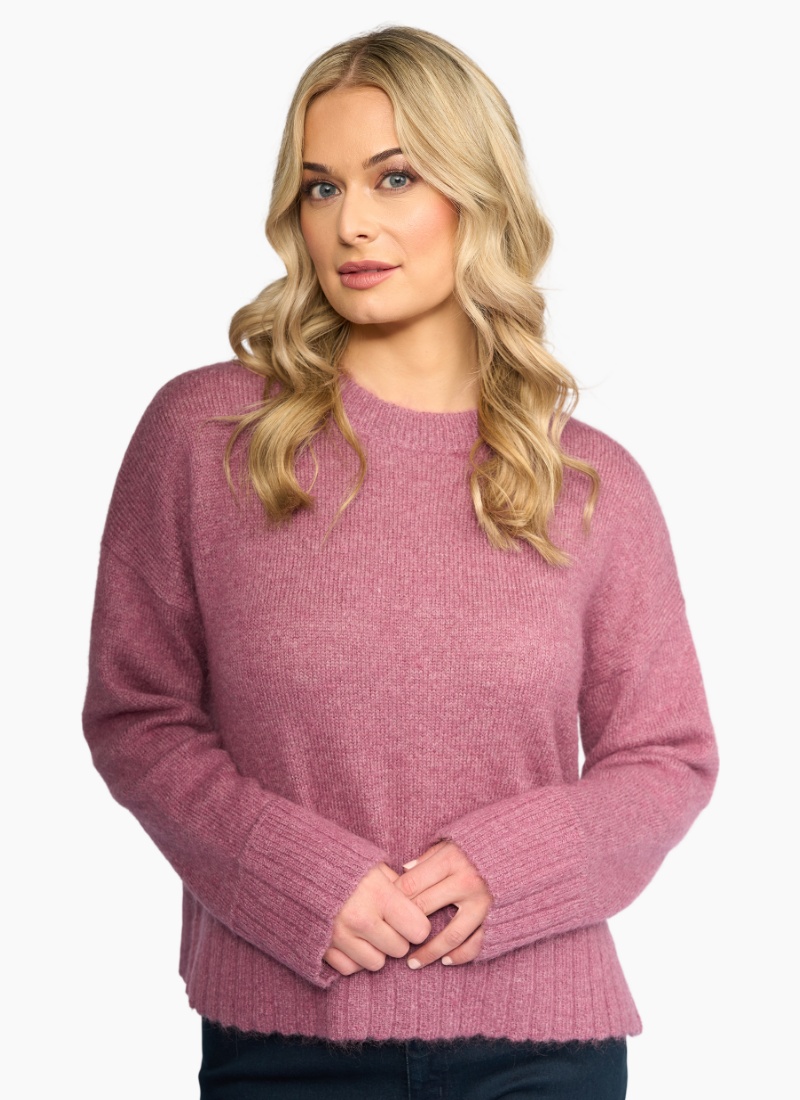 A soft, cosy sweater in our Port shade — a rich purple-pink tone. Made with a blend that includes wool and mohair for warmth, this relaxed-fit knit features drop-shoulder sleeves, a high-low hem with side splits, and ribbed detailing at the neckline, cuffs, and hem for a comfortable, easy silhouette.