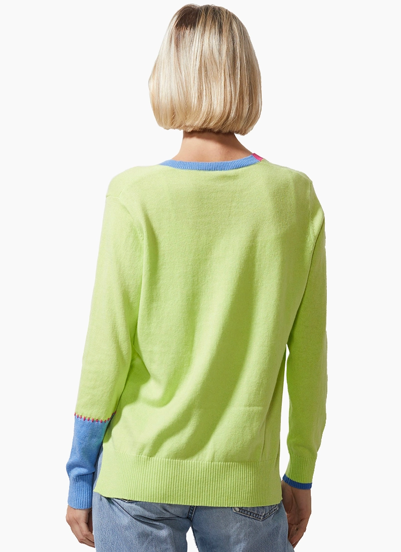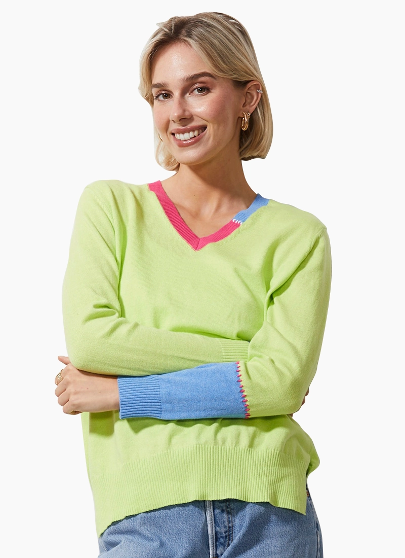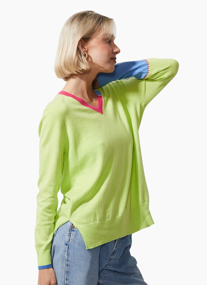 V/neckline with embroidery detail, contrast on one sleeve with embroidery side splits
