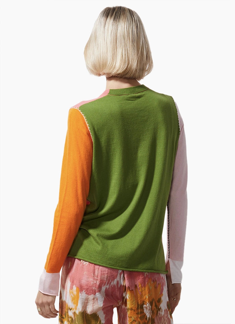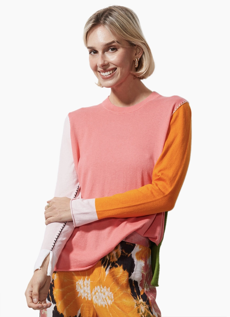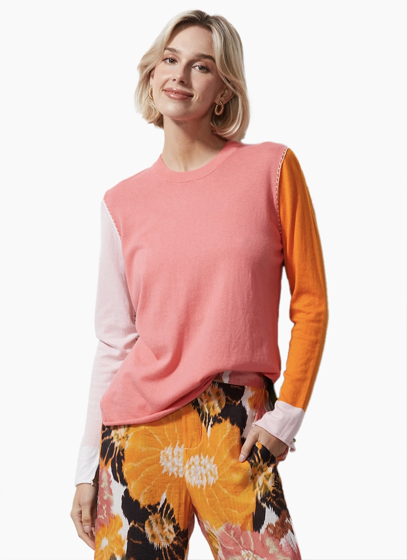 Crew neck, colour block jumper with blanket stitch detail and roll hem