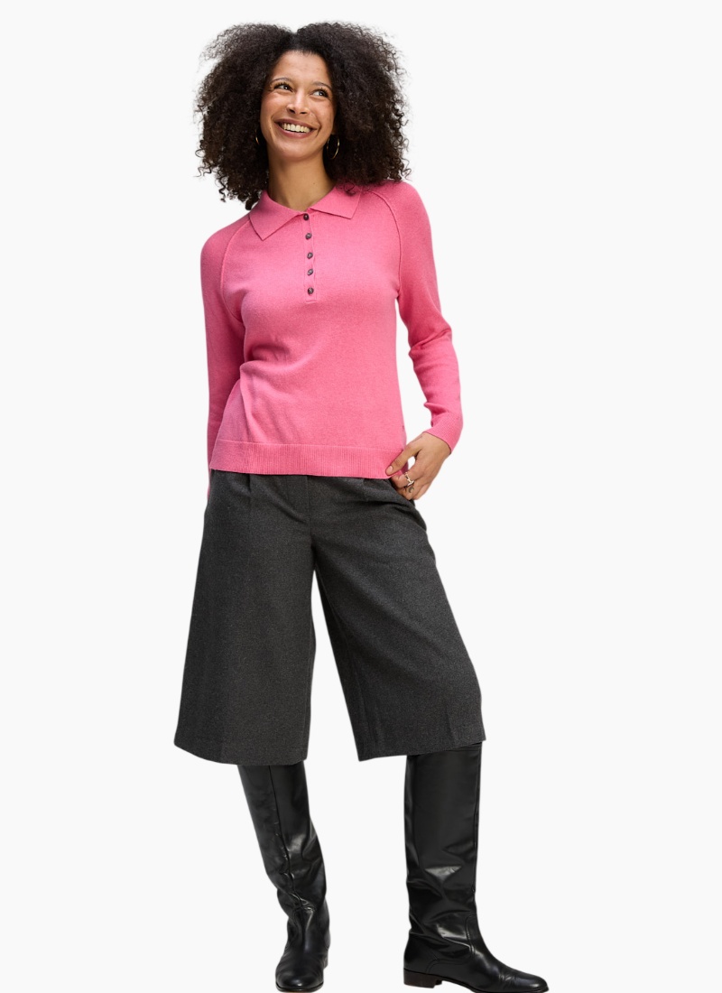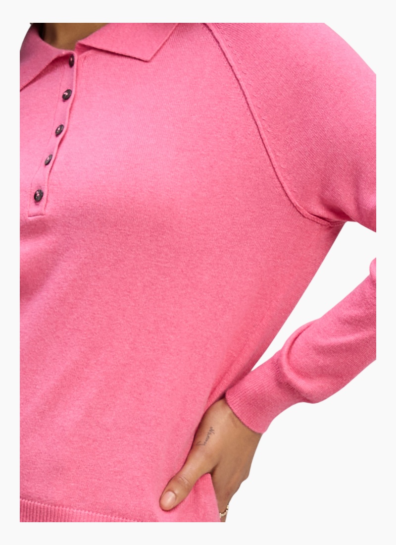 Introducing the Henley Essential Rhubarb from Zaket & Plover. This vibrant collared jumper brings a fresh pop of rhubarb pink to your wardrobe with a refined, easy-to-wear silhouette.