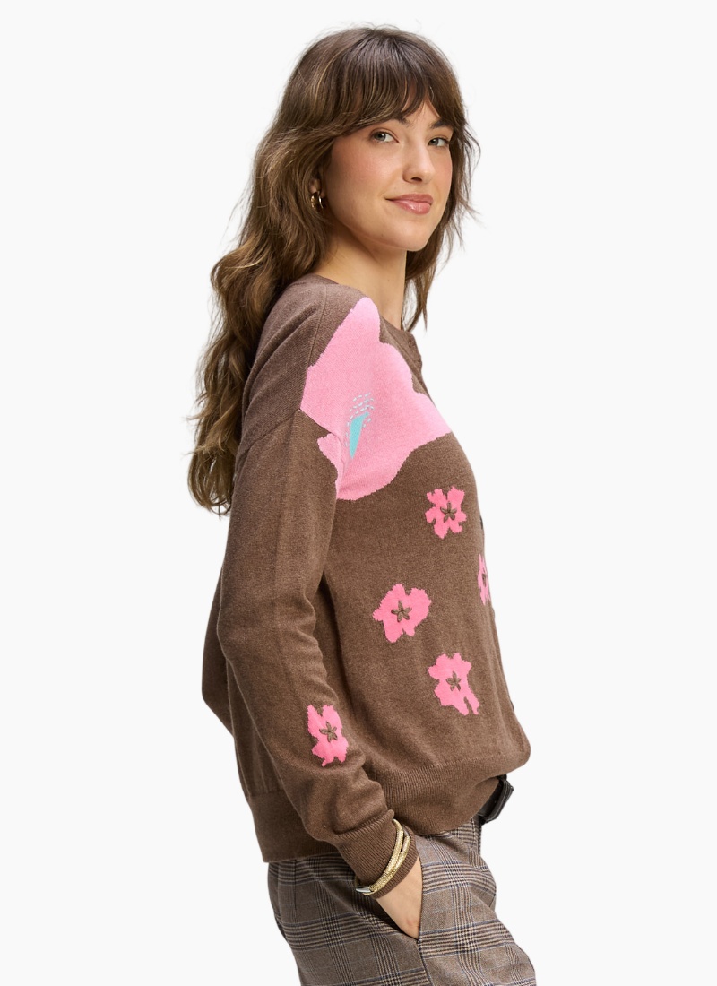 - Playful pink floral intarsia set against a brown base gives a boutique, hand-finished feel