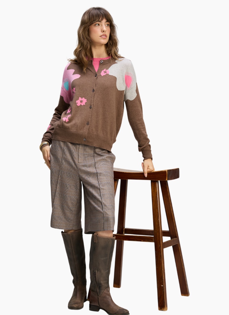 Introducing the Petal Play Cardi from Zaket & Plover. This cosy, contemporary women's jumper pairs whimsical pink petal intarsia with a rich brown knit for a playful yet polished look.