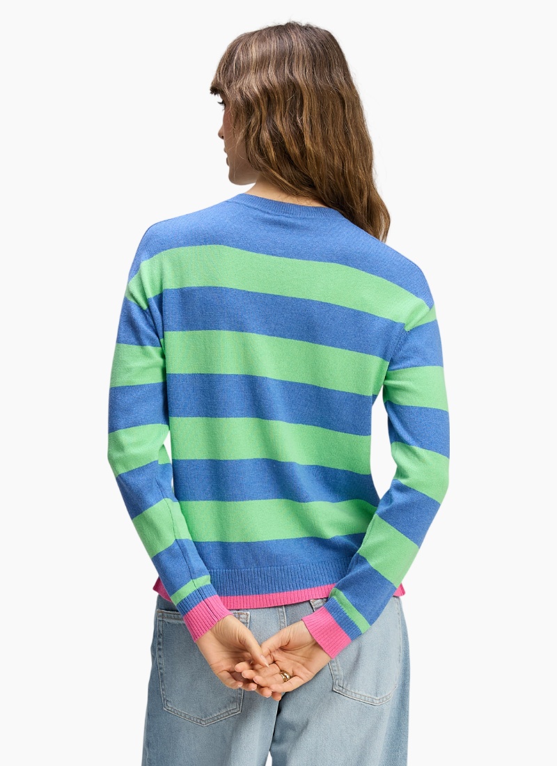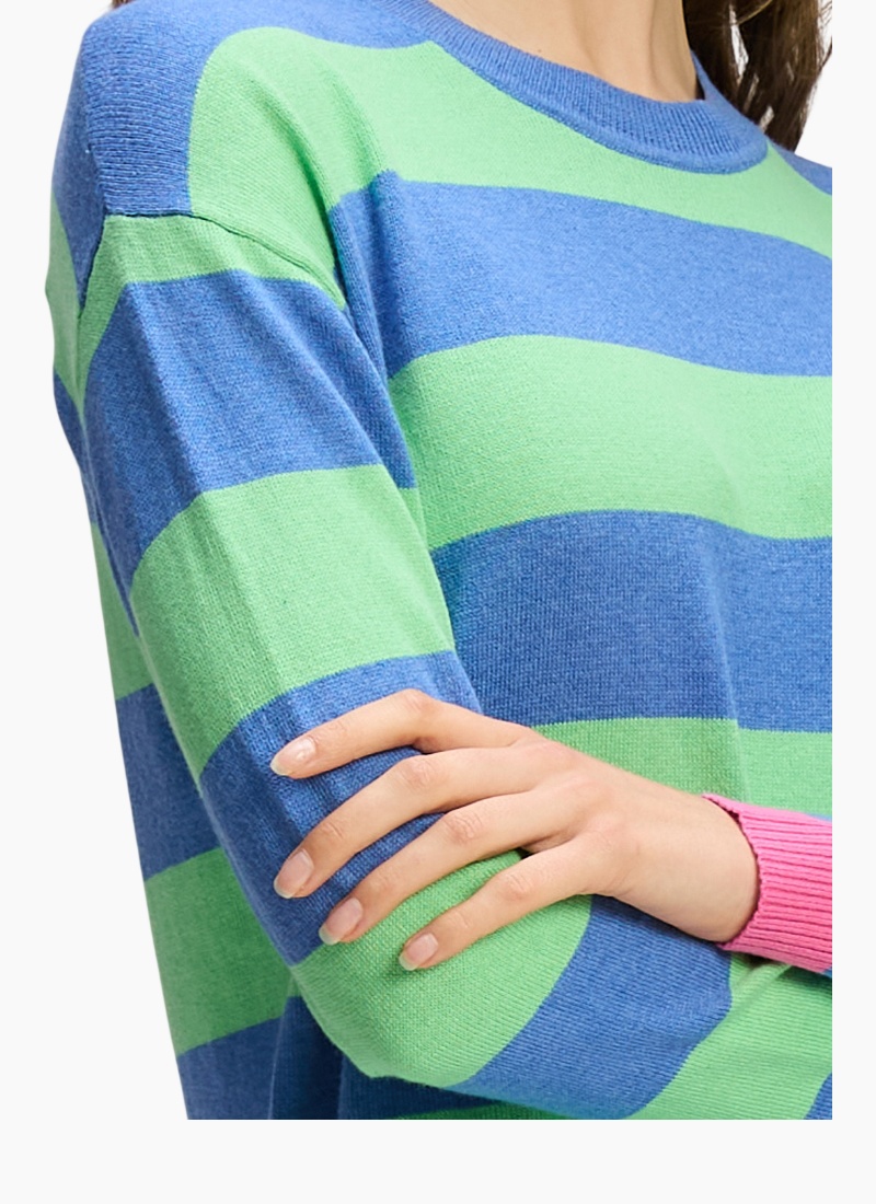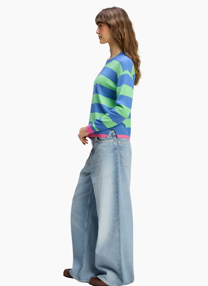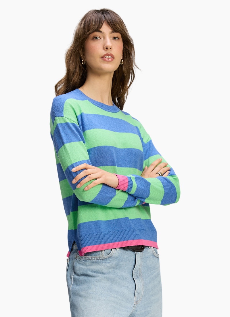 Introducing the Stripe Clash Jumper from Zaket & Plover. A playful, modern jumper that brings bold blue and green stripes and a pop of pink trim to your everyday wardrobe.