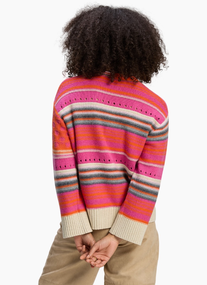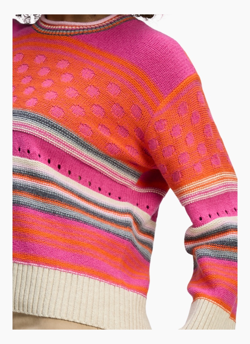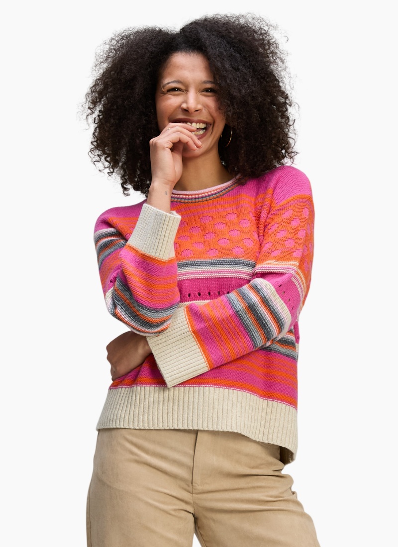 - Bold amaranth pink and orange stripe colourway with contrasting ribbed cuffs and hem