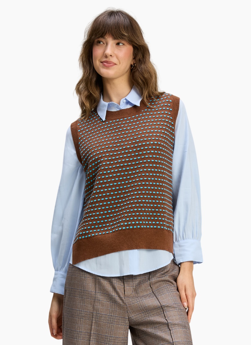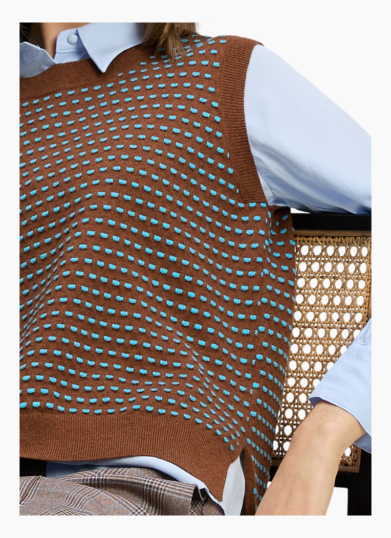 Introducing the Textured Tank Coffee from Zaket & Plover. This sleeveless jumper blends cosy knitwear craftsmanship with a modern, layered silhouette.