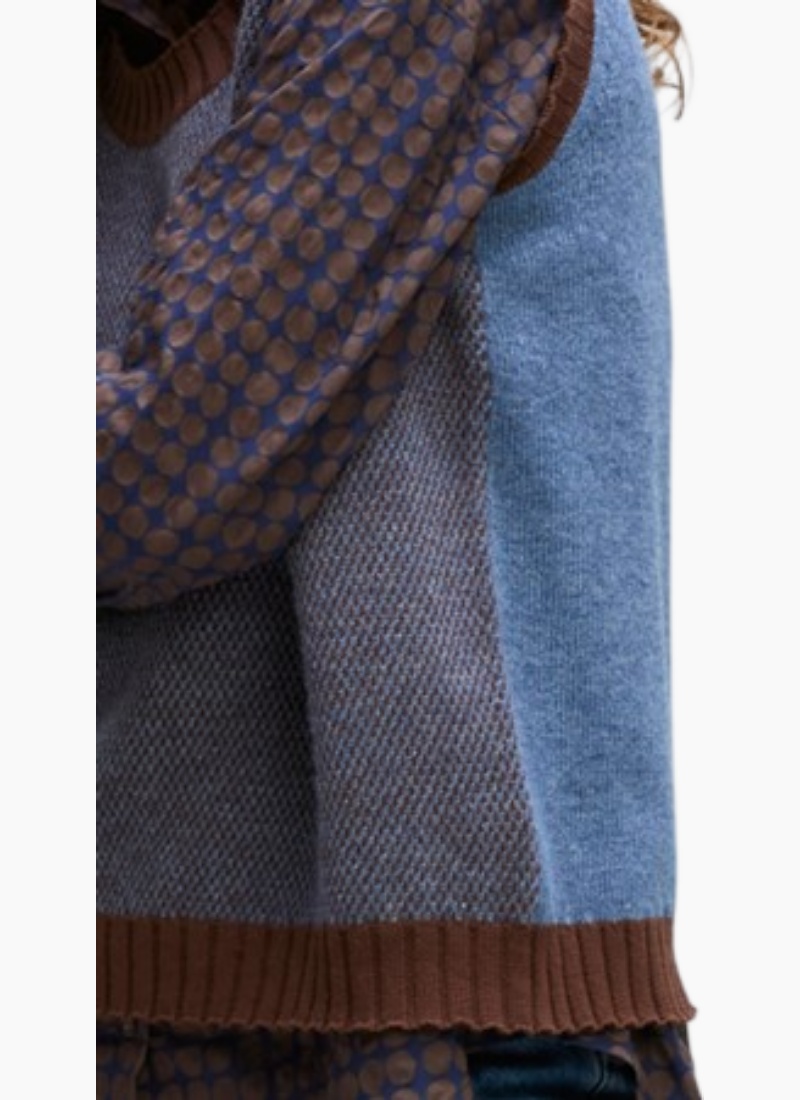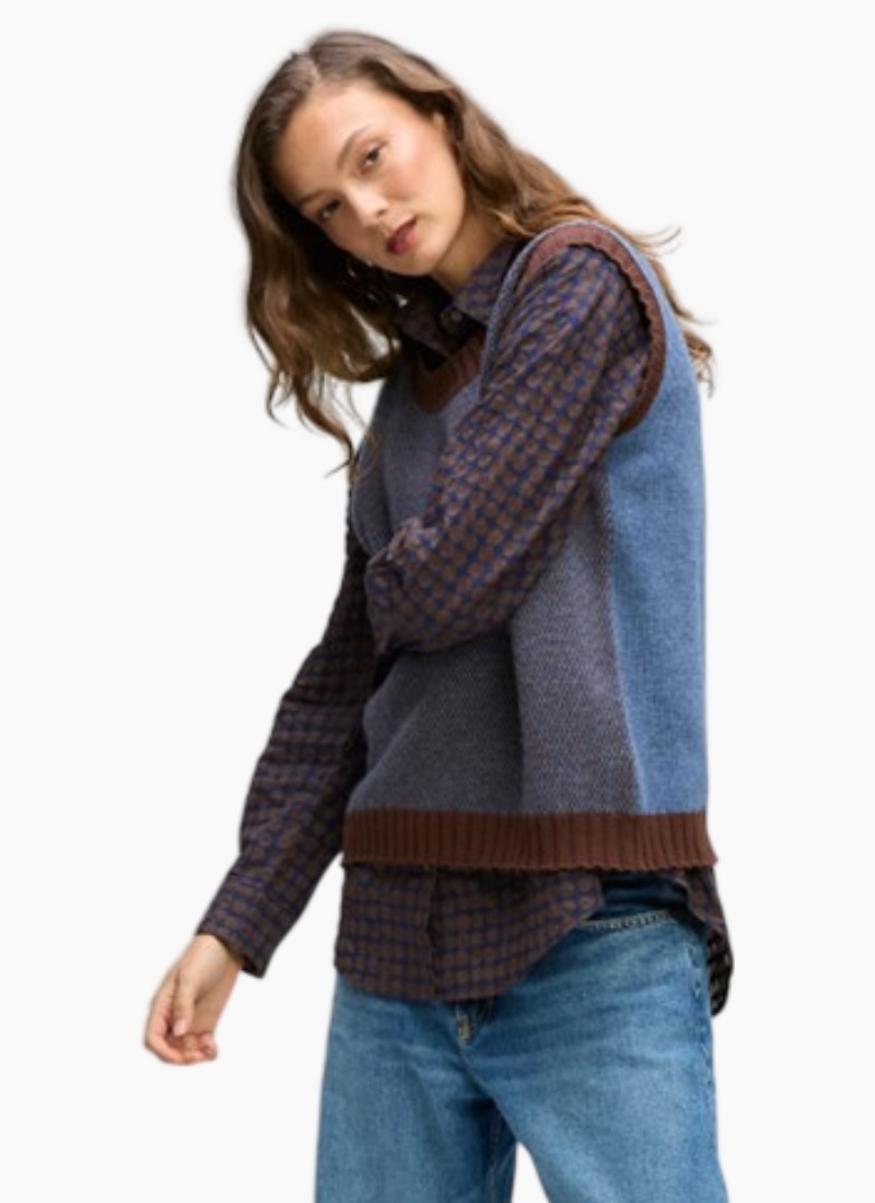 - A versatile women's vest finished in a denim blue colour with contrasting brown trim
