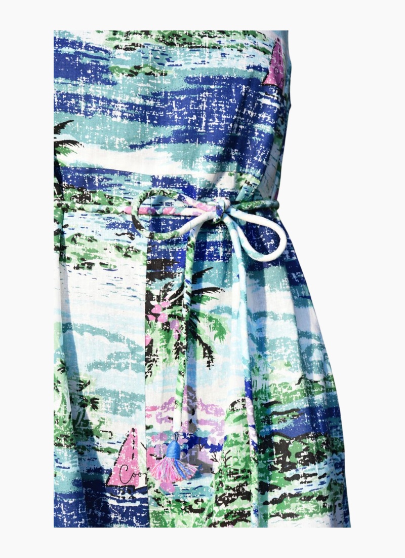 - Features a vibrant turquoise-blue and green tropical colour palette with playful sailboat and palm motifs