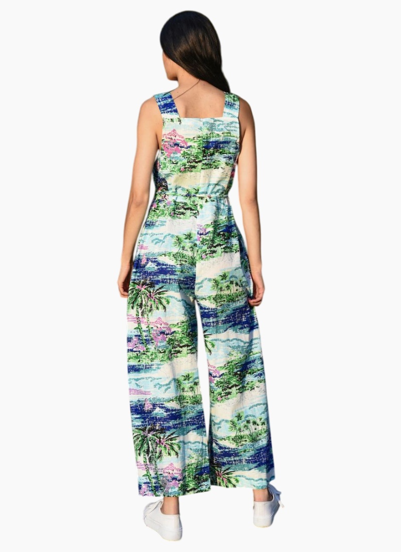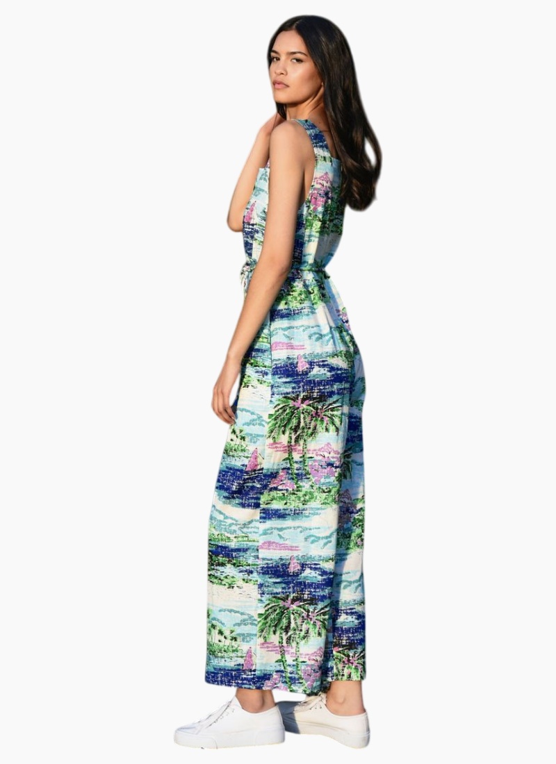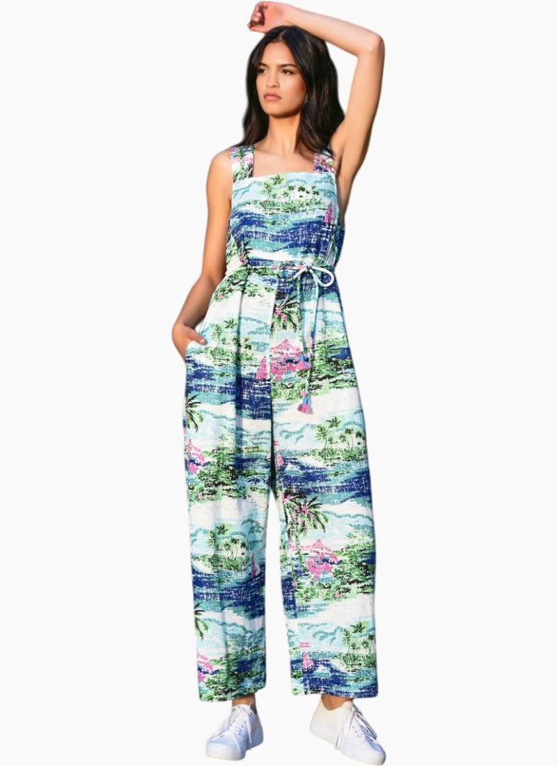 Introducing the BEACH PLEASE PANTSUIT from COOP. This breezy, tropical-print playsuit is perfect for sunlit days and coastal escapes.