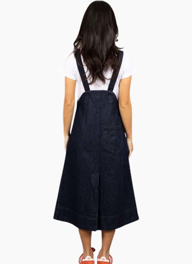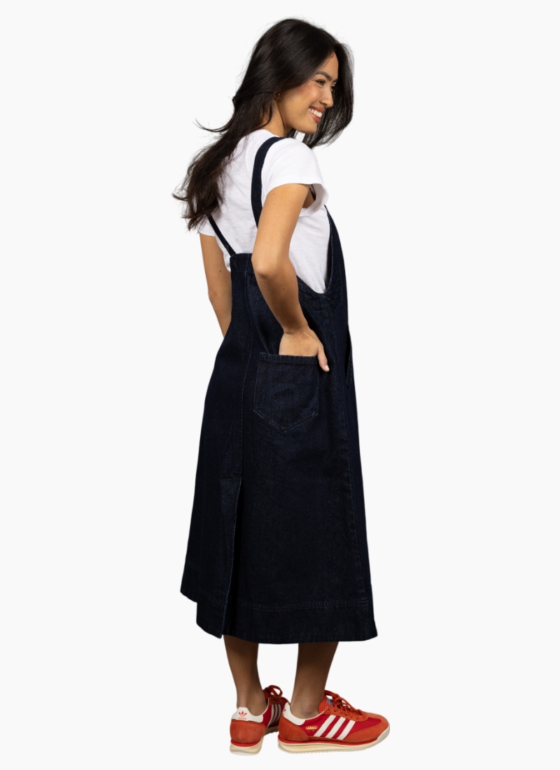 A fresh take on classic denim. The Edit Pinafore is relaxed, versatile and made for layering year-round. Crafted from breathable cotton denim, it features adjustable straps, clean lines and a flattering A-line cut and everyday style at its best. Cute back features like the patch pocket with signature embroidery H detail, adjustable; straps and a back split that allows for movement. She’s a great base for so many looks year-round – paired here with white tee. · 100% cotton denim pinafore. · Relaxed A-line silhouette with flattering midi length. · Square neckline. · Thick adjustable straps with buttons at back. · Patch pocket at chest with two functional cutaway pockets at sides. · Signature “H” embroidered logo on back patch pocket. · Back split for ease of movement. · Designed to layer over tees, tanks or knits. · Hem finishes above the ankle. This is a lovely dark denim, we suggest washing this garment a few times before you pair with light colour, as you may have some dye release in first few wears.