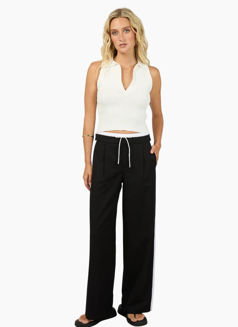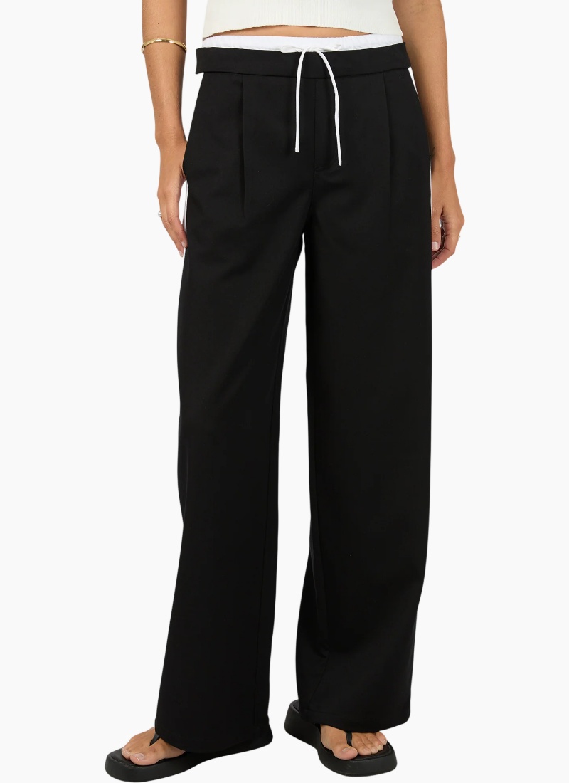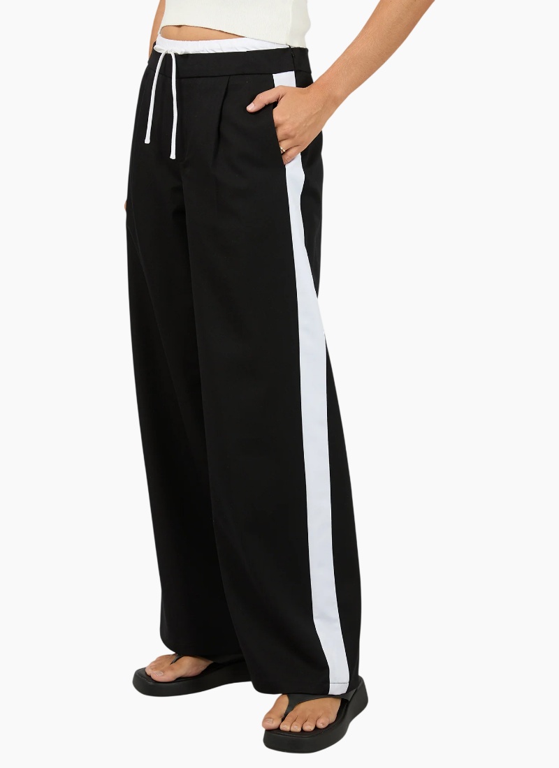 A modern take on relaxed tailoring, The Beckett Pant in Black, designed both comfort and everyday polish. Cut in a relaxed fit with a straight leg, it features contrast side panel detailing that adds a sporty, contemporary style. The elasticated waistband with adjustable drawcord ensures a comfortable, flexible fit, while functional pockets add practicality. These pants move easily while maintaining structure. Perfect for styling with knits, or tees for effortless, off-duty dressing. Relaxed Fit Contrast Panel Pockets 75% Polyester 18% Rayon 4% Elastane Model wears size 8