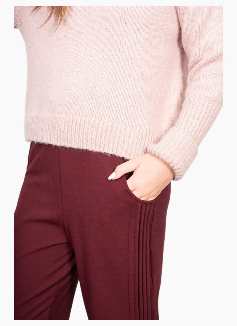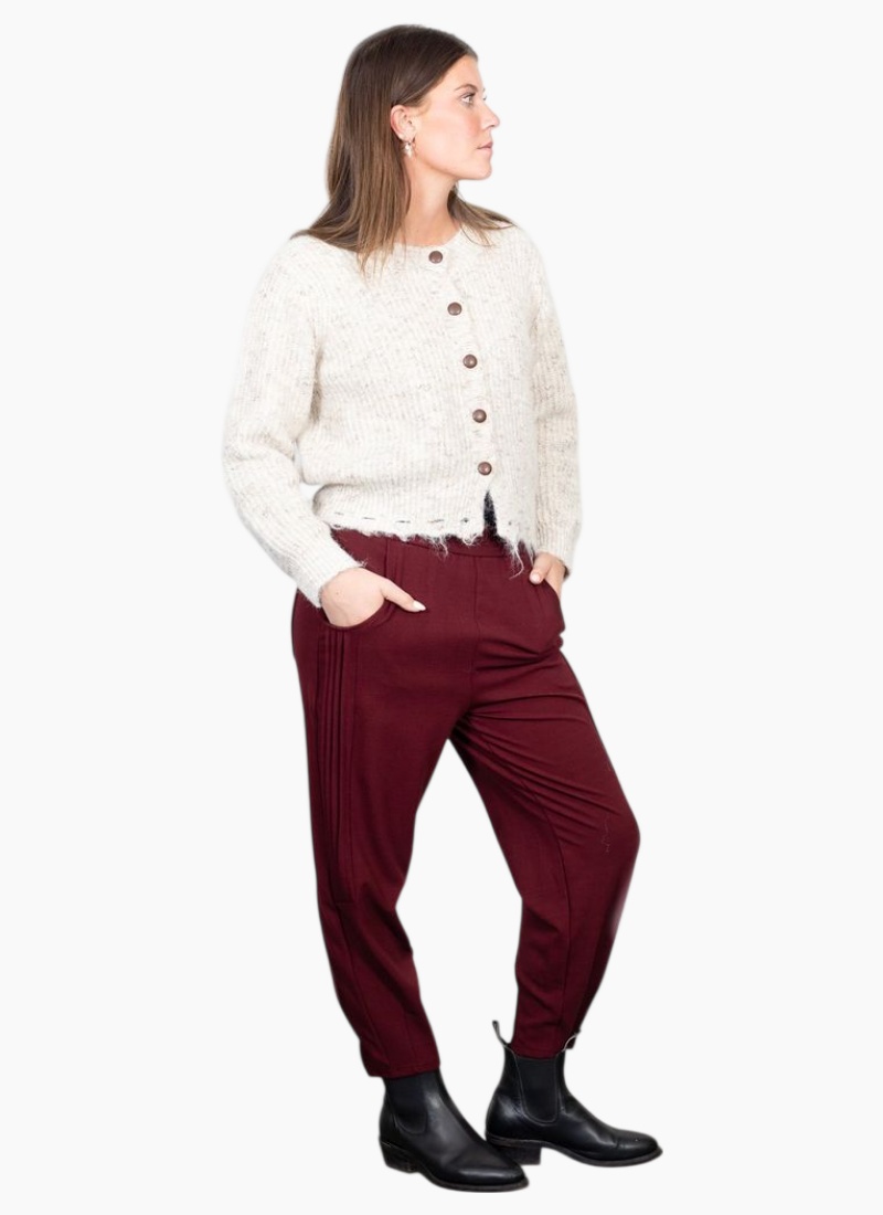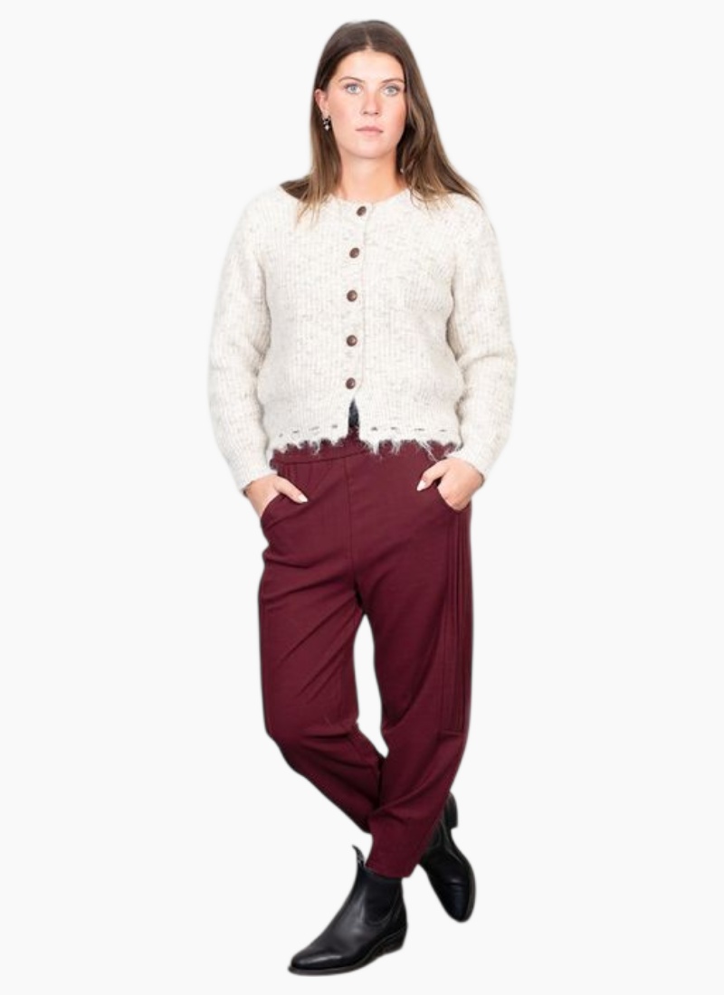 A timeless favourite.Our classic black pant, featuring a gorgeous pleat side detailing now also available in Merlot. Designed for both style and comfort, it boasts a flattering elastic waistband and functional pockets, making it a perfect everyday essential. The cropped leg adds a contemporary edge, making them perfect for pairing with boots or statement flats. They are a must have trans seasonal piece for any wardrobe. Also available in Black & Navy 65% Cotton | 25% Polyester | 10% Spandex
