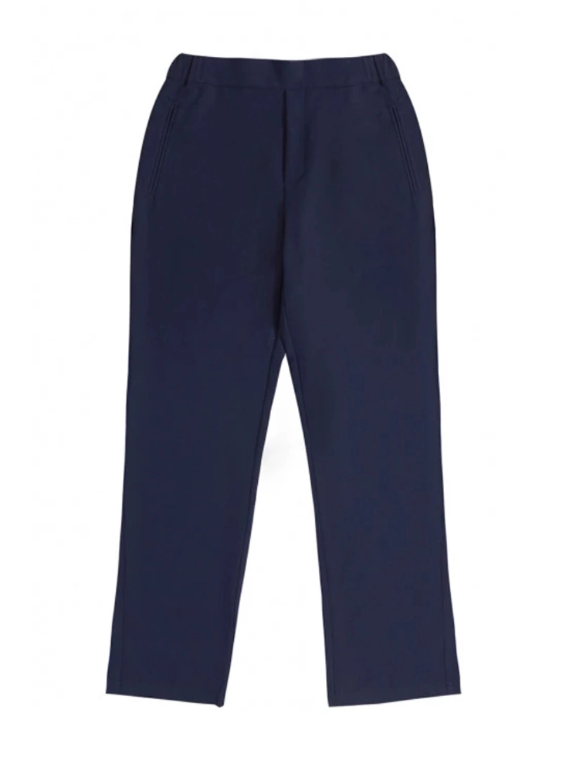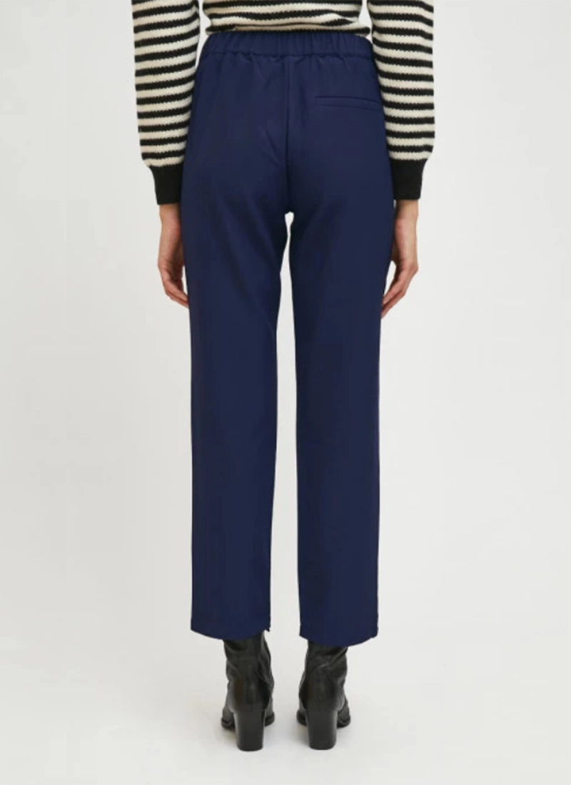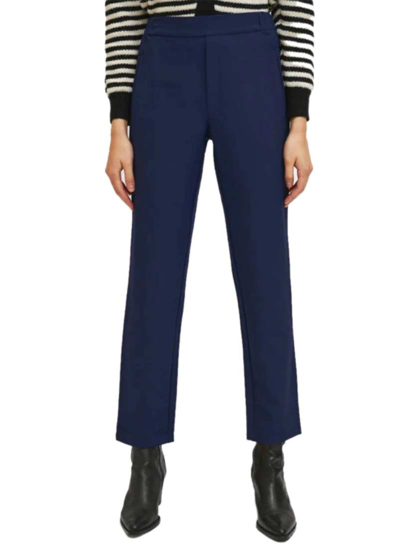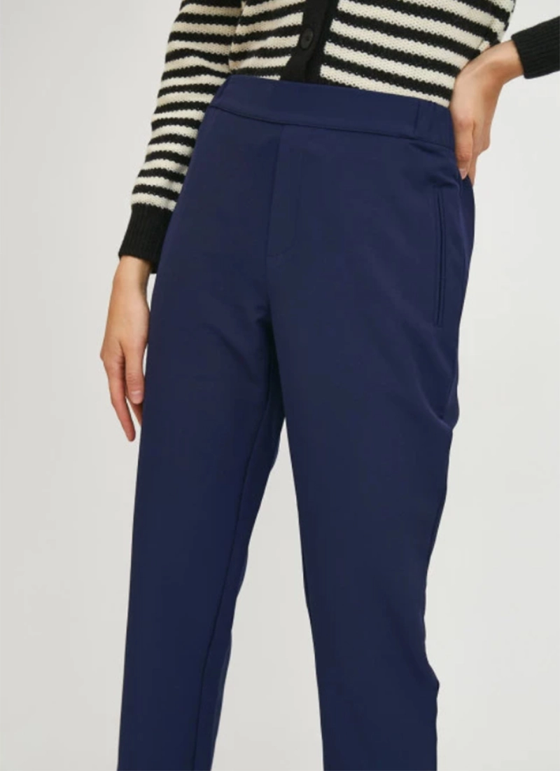 Blue straight-cut mid-rise trousers. Fixed waist with elasticated back. Side pockets. Model wears size S.