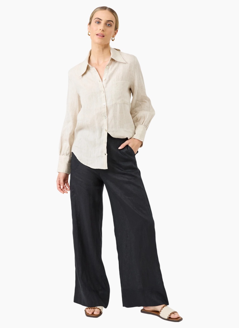 Introducing the Eb&Ive Studio Pant — Ebony. A refined wardrobe essential, these trousers combine relaxed tailoring with a breathable linen feel.