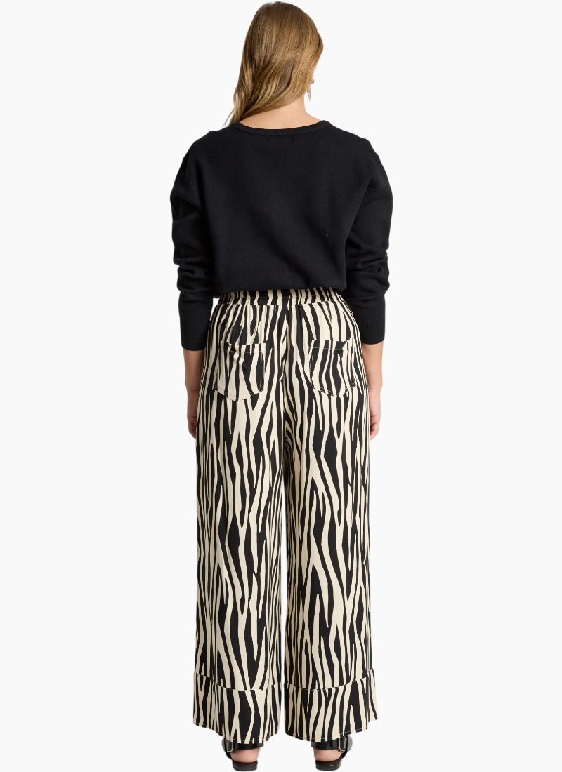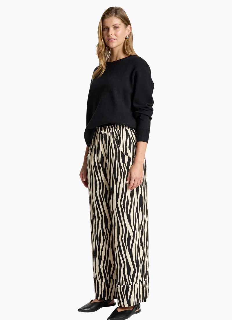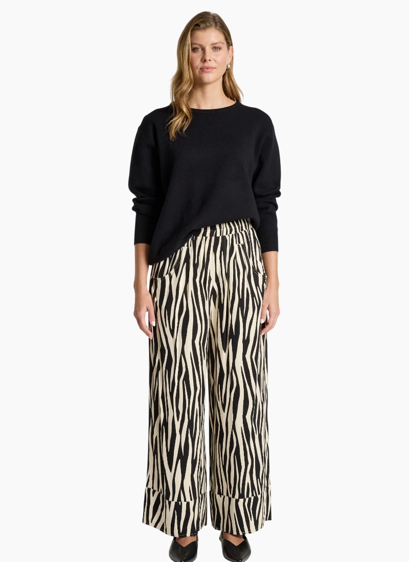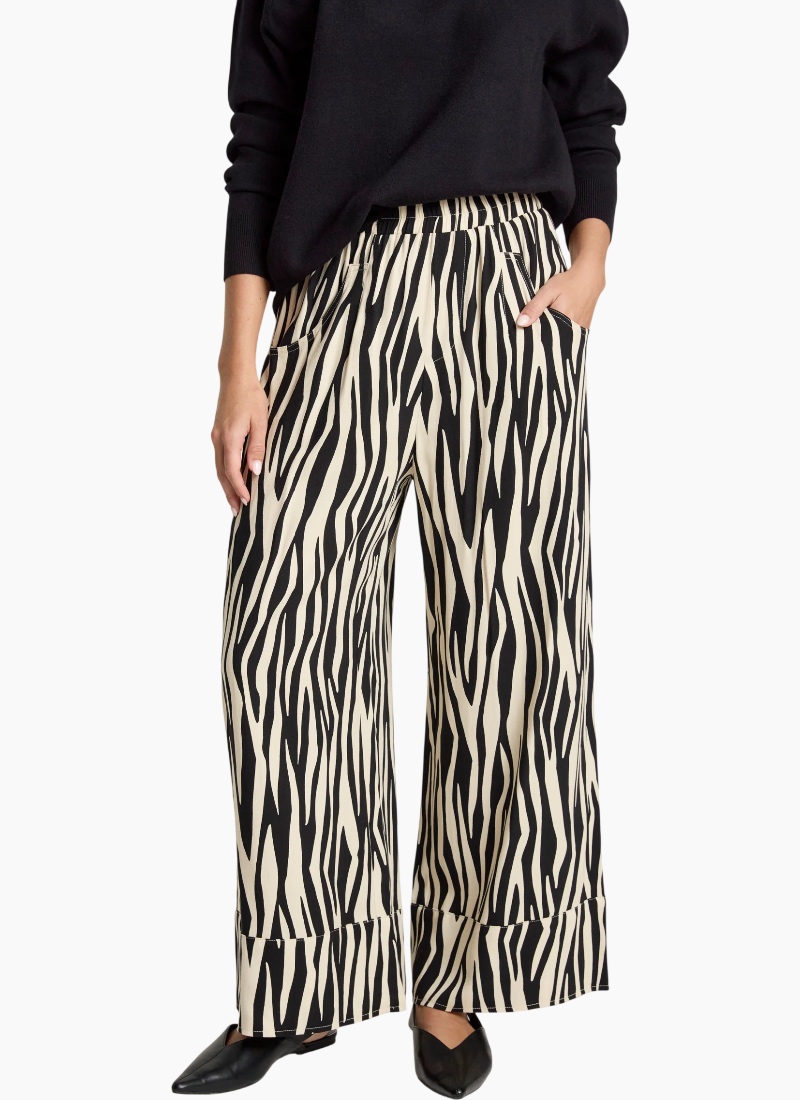 A refined winter-weight pant crafted from a softly draped fabric with a subtle sheen. Designed with an elasticated waistband, wide straight leg and pockets, it offers a polished yet comfortable option for everyday wear. Style with knitwear or the San Top for a clean, coordinated look. Design Features Elasticated waistband for comfort Wide straight leg silhouette Wide hem detail Functional pockets Softly draped fabric with subtle sheen