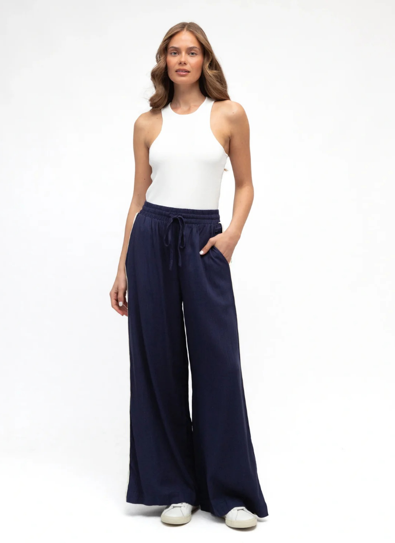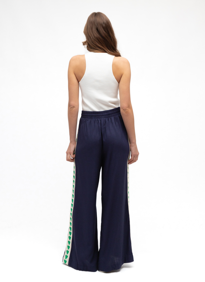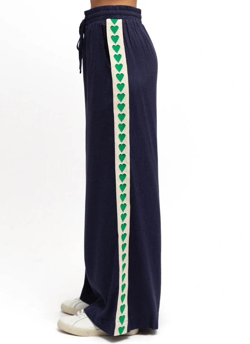 Introducing the Navy Green Heart pants from Ebby And I. This relaxed wide-leg pant blends playful heart detailing with effortless, everyday elegance.
