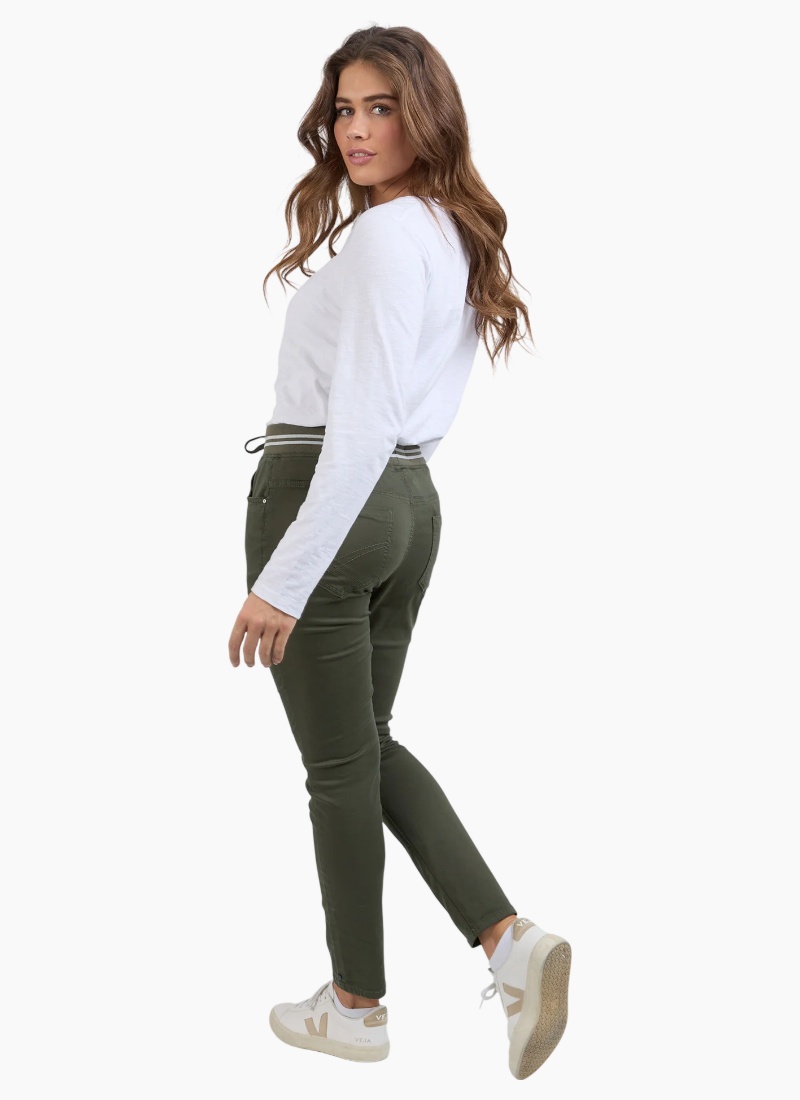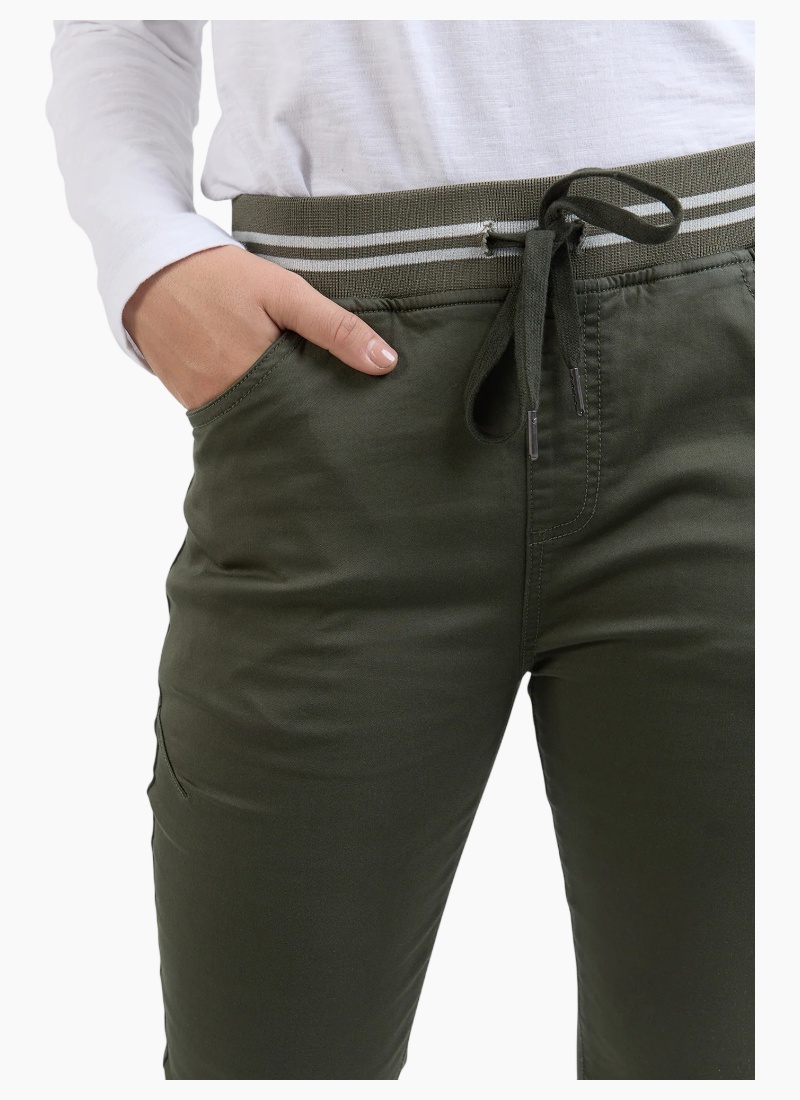 The Margo Jogger are a functional and fantastic stretch drill pant featuring a slim leg and comfort plus rib waist band with a cute ribbed stripe. Stretch hybrid denim Slim leg Stripe ribbed waistband Cotton polyester elastane Model is wearing a size 10