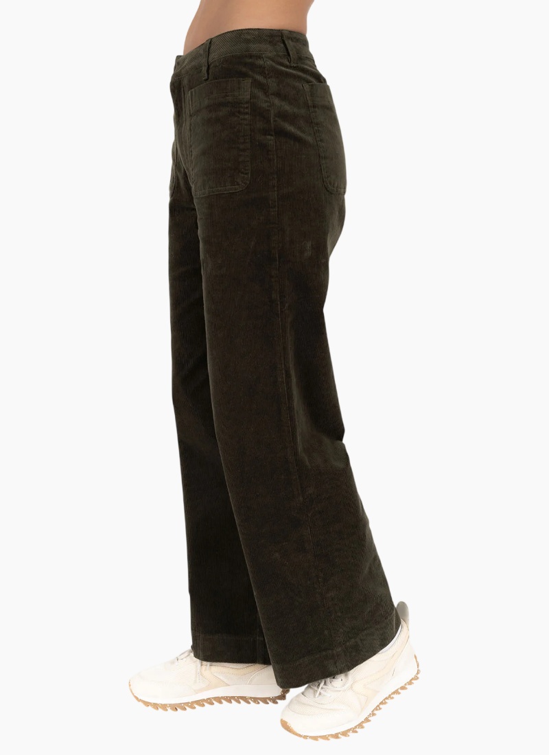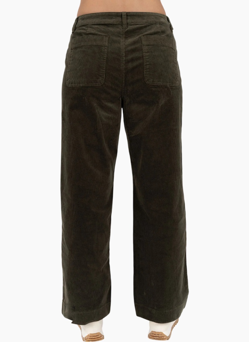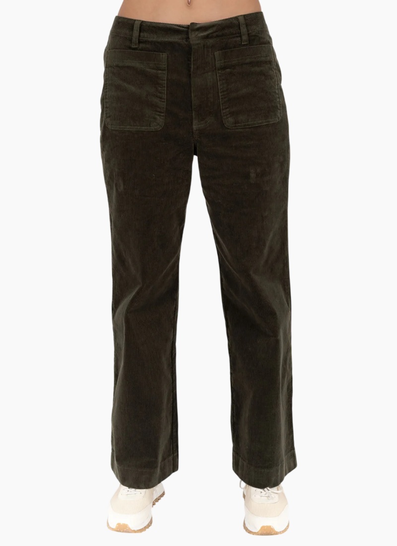 Super stretchy pocket detail corduroy pants. Can be worn high or mid waisted with straight leg and relaxed fit. Zip fly with concealed clasp and button closure. Belt loops at waist. The functional patch pockets at front and back are a design feature of these pants. Darts at back offer a figure-flattering fit. Super stretchy, mid-weight 11 whale corduroy that is oh-so lush to touch. Sits at ankle length on average height.