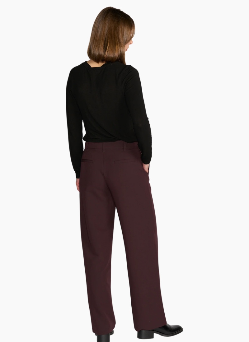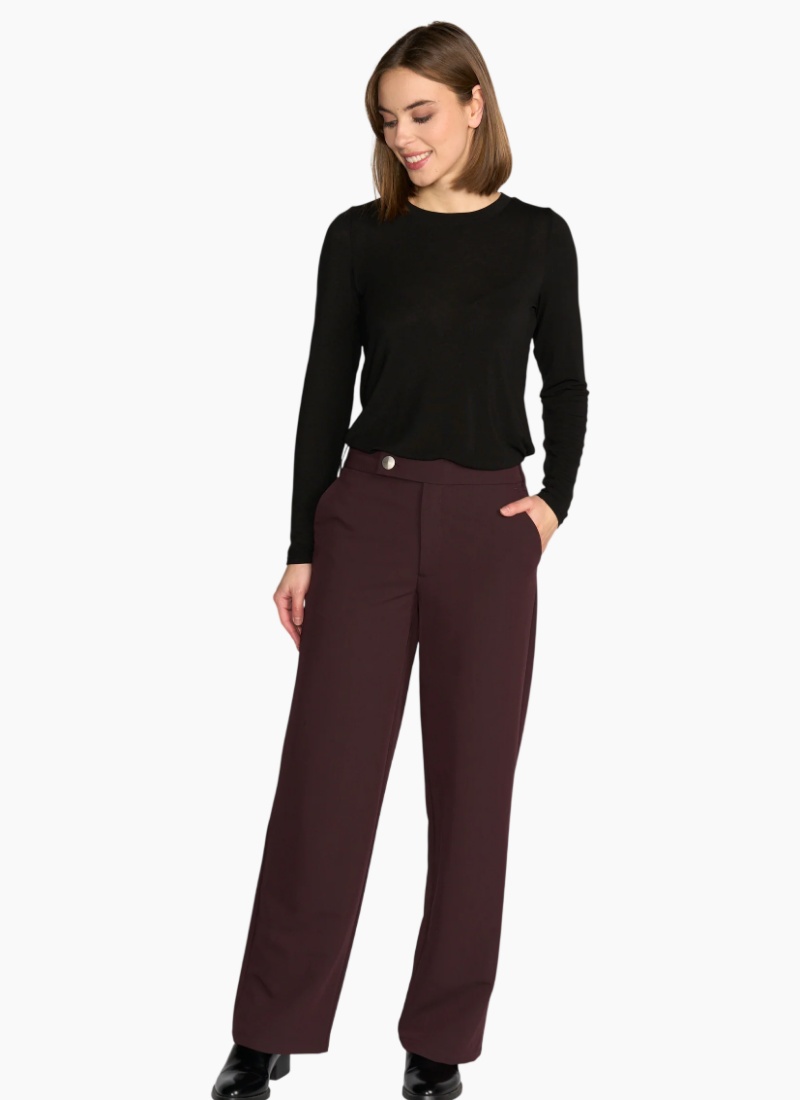 Full-length wide-leg pant in Raisin, a dark purple-red tone, designed with an off-centre tab closure finished with a silver button. This tailored style offers a clean, formal silhouette with a modern asymmetric waistband detail.