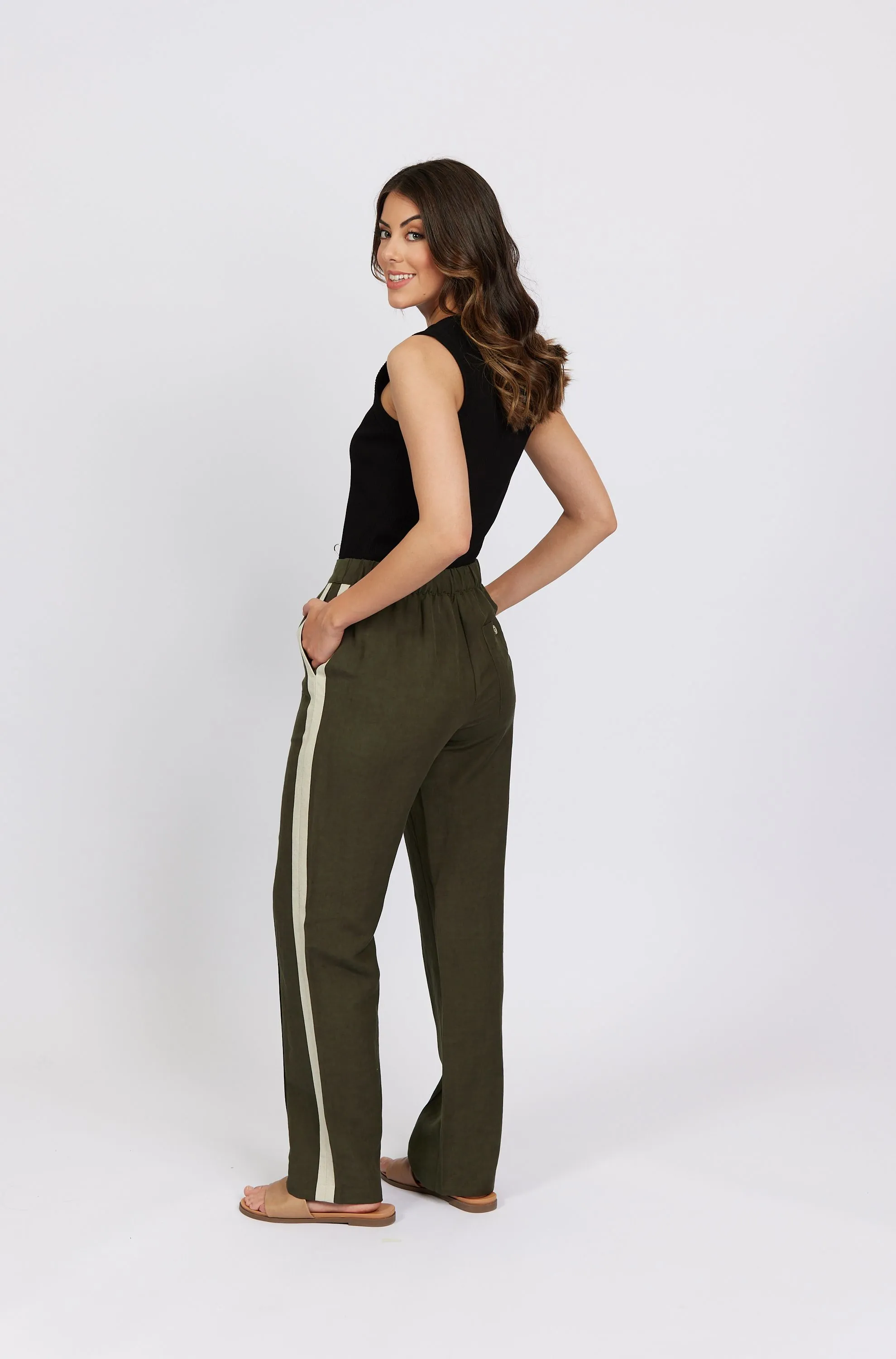 • KNEWE LABEL Elton Pant in Khaki/Ecru• Made from a lightweight linen/viscose fabric• Straight leg full length pant• Front pintuck detail• Contrast side seam stripe detail• Pull on style with a flat front and an elastic back waistband• Front side angle pockets• Back patch pocket with tortoiseshell button on wearers right-hand side• Model wears size 10