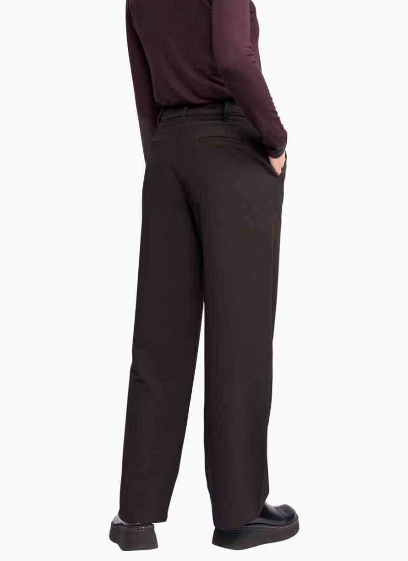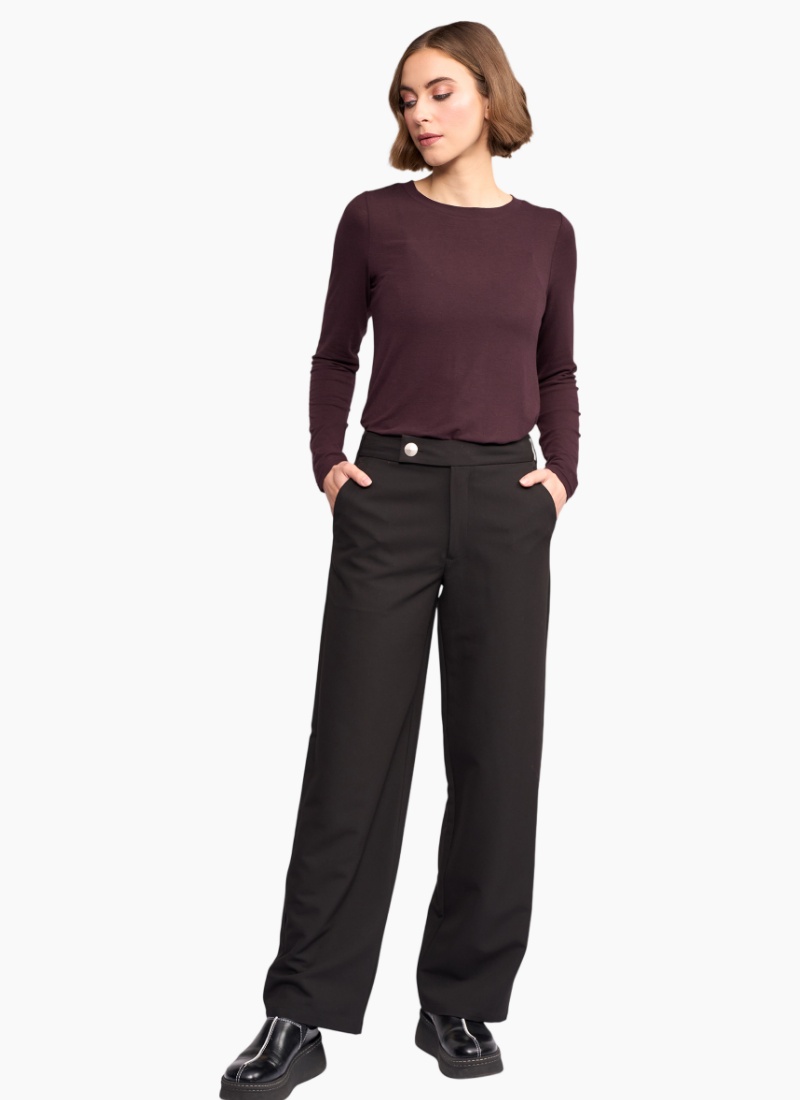 Full-length wide-leg pant in black, designed with an off-centre tab closure finished with a silver button. This tailored style offers a clean, formal silhouette with a modern asymmetric waistband detail. Pairs back perfectly with the Carter Blazer, see other listing for a matching/corporate set. • Full length, wide leg pant • Waistband features off-centre tab with silver button closure • 2 front beltloops, 3 back belt loops • Zip fly • Two front side angle pockets • 2 faux back welt pockets • Model wears size 10, and is 175cm tall 79% Polyester 15% Rayon 6% Elastane