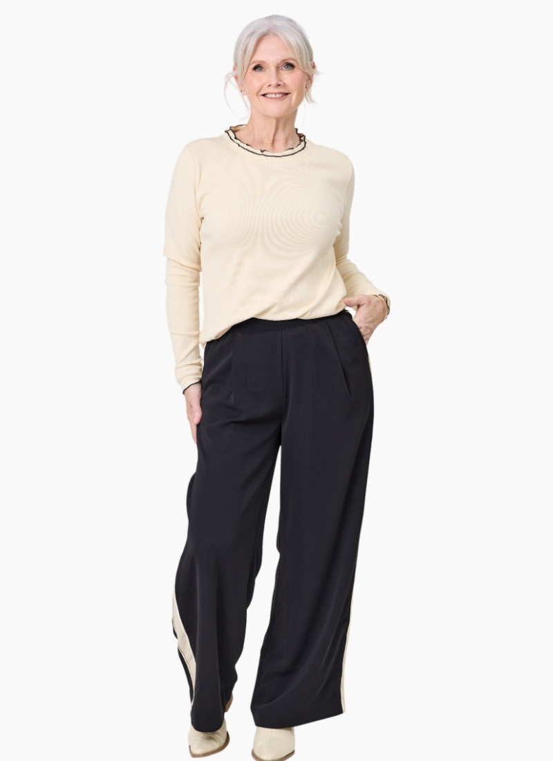 Introducing the Daria Pant from Lemon Tree. These fluid black pants with a contrasting cream side stripe bring modern polish to everyday dressing.