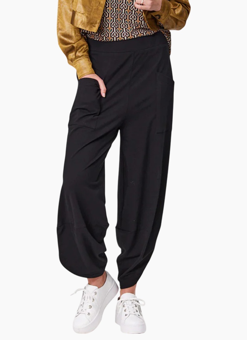 - Elasticated waistband and relaxed cut with a gathered tapered ankle for easy movement and a modern silhouette