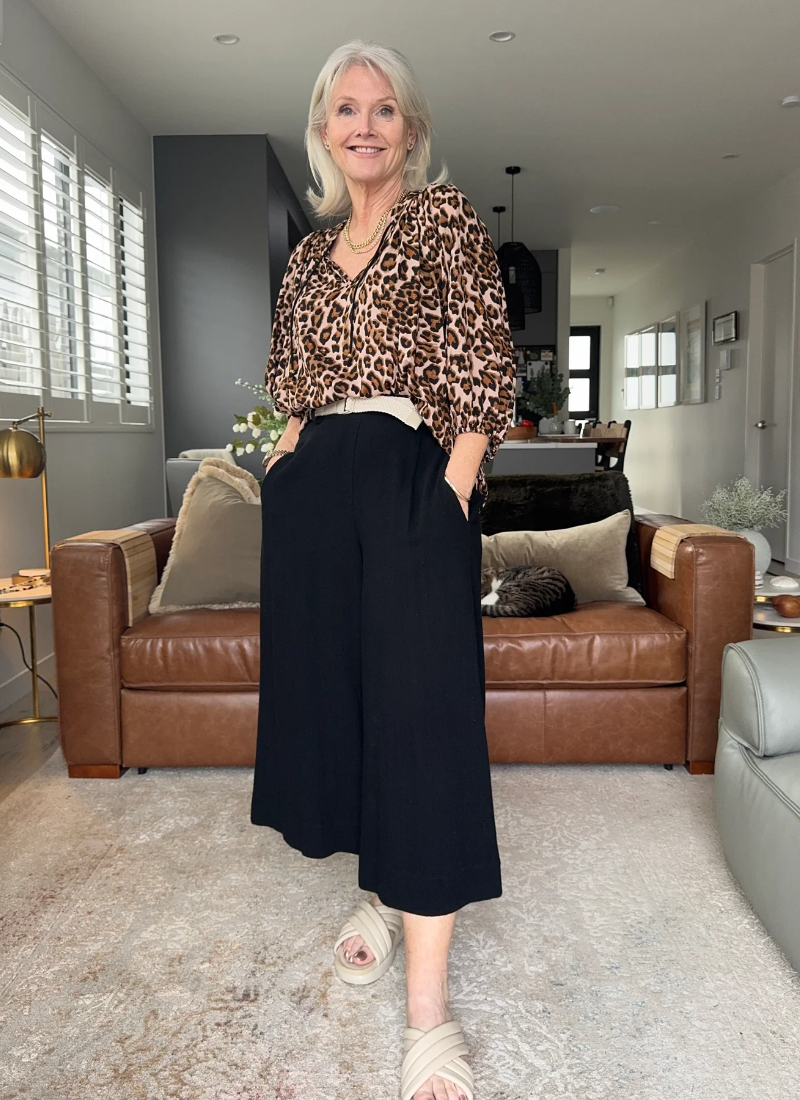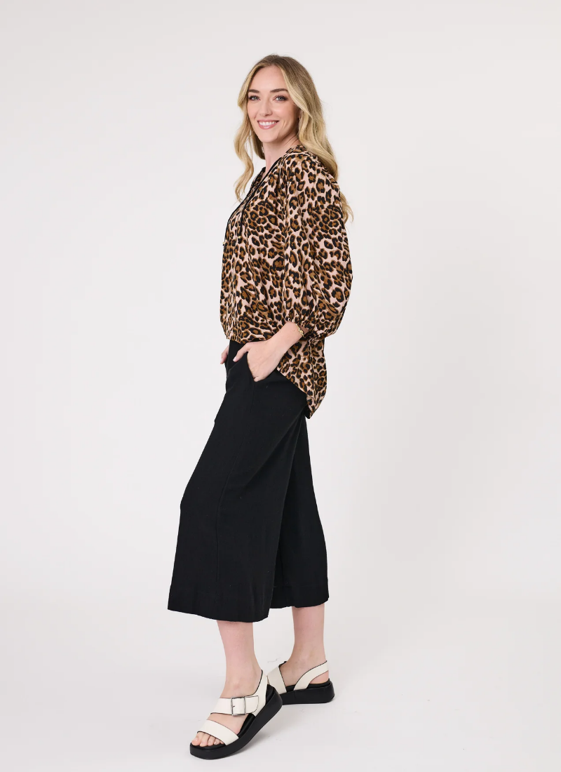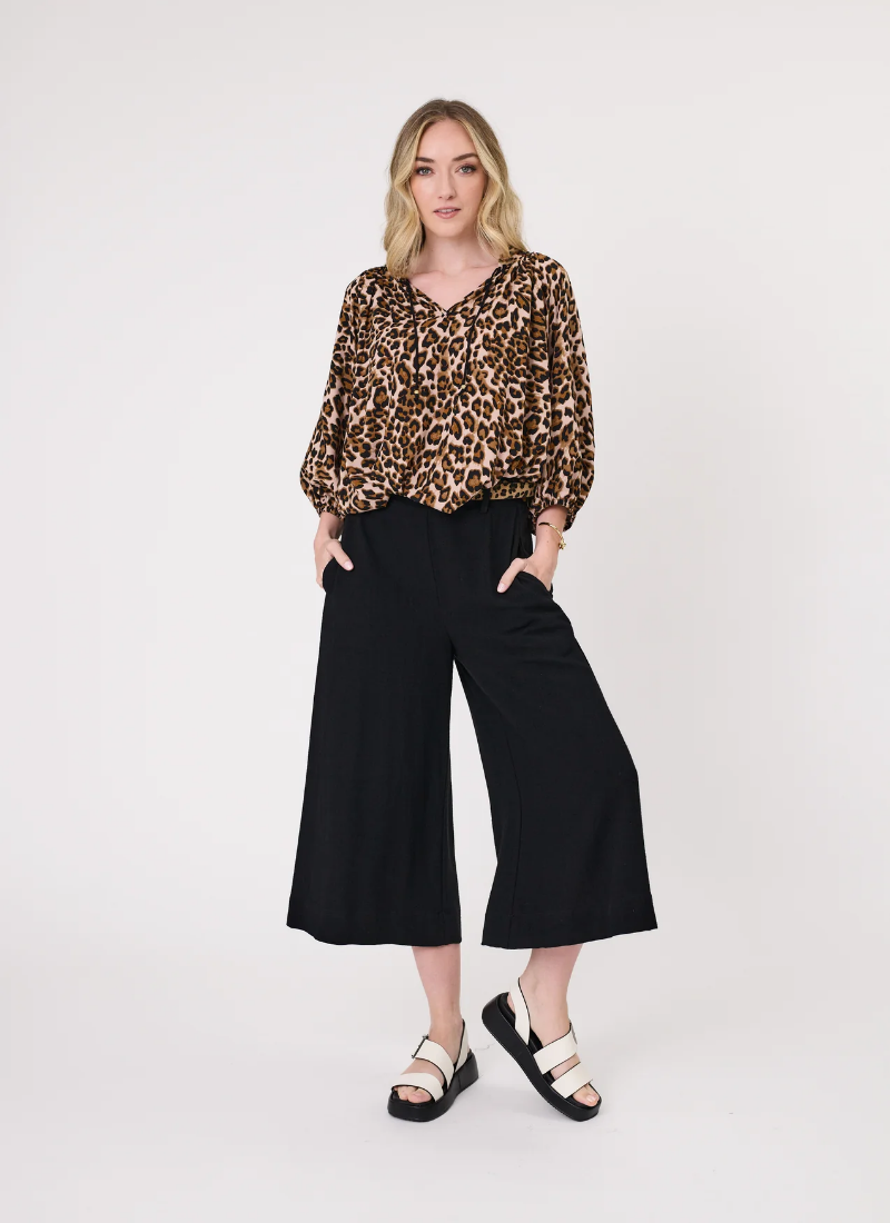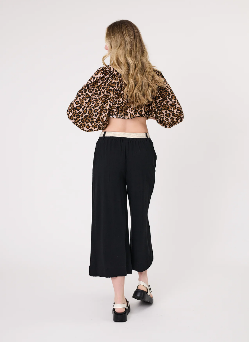 • Effortlessly versatile pants in Black with a flowy, wide-leg silhouette.• Features three-quarter length, belt loops, and functional pockets. • Crafted in a beautiful textured linen -viscose blend for a relaxed look.