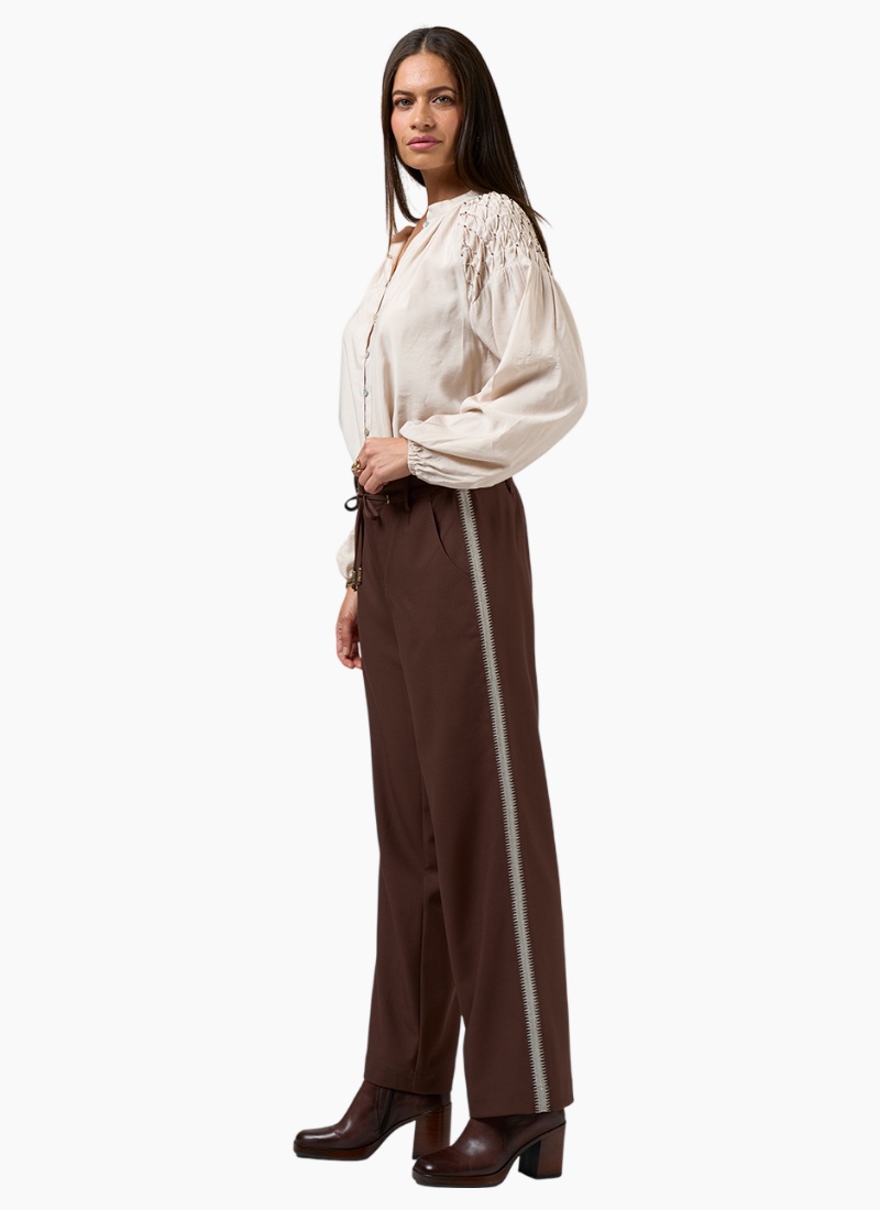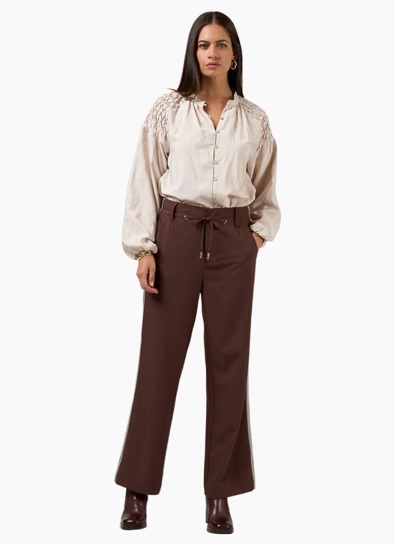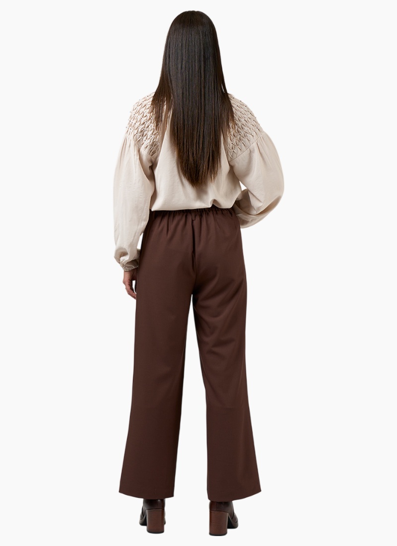Introducing the Bespoke Pant-Cocoa from Loobies Story. These cocoa-coloured pants in a soft crepe polyester blend combine relaxed tailoring with a contemporary edge.