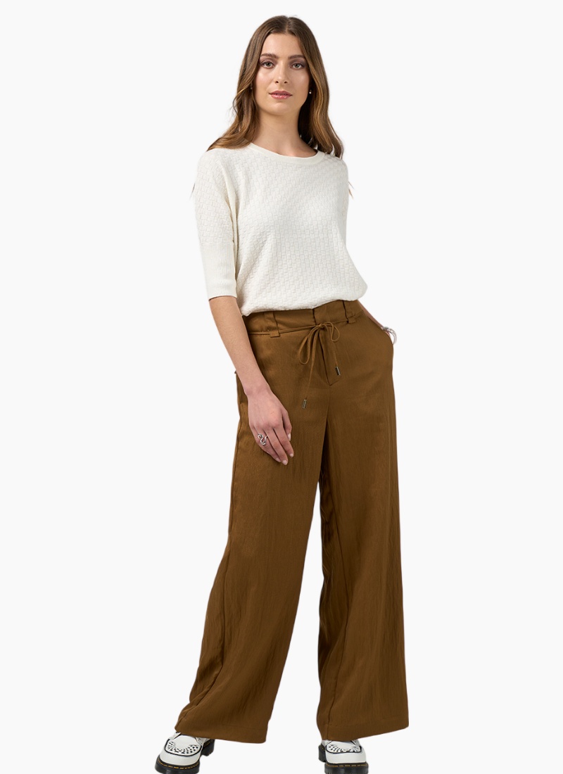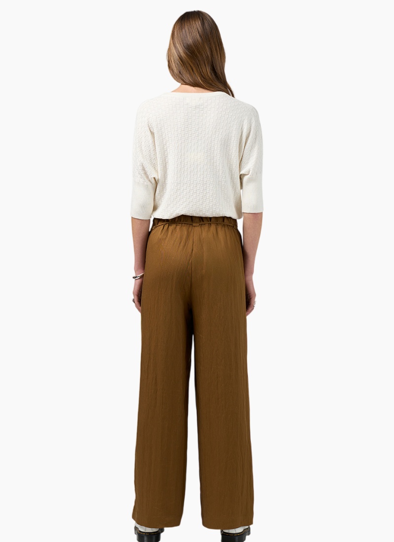 A wide leg pant with a fly front, elasticated back waist and functional in-seam pockets, featuring a waist tie with fine metal toggles and a single back pocket.