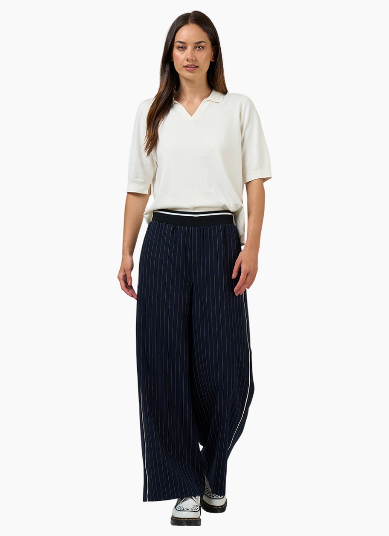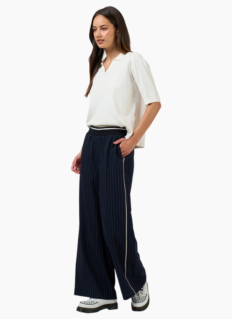 - Navy from Madly Sweetly. These women's Pants arrive in a rich navy colour with subtle pinstripes and a contrasting side stripe, offering a contemporary, relaxed silhouette.