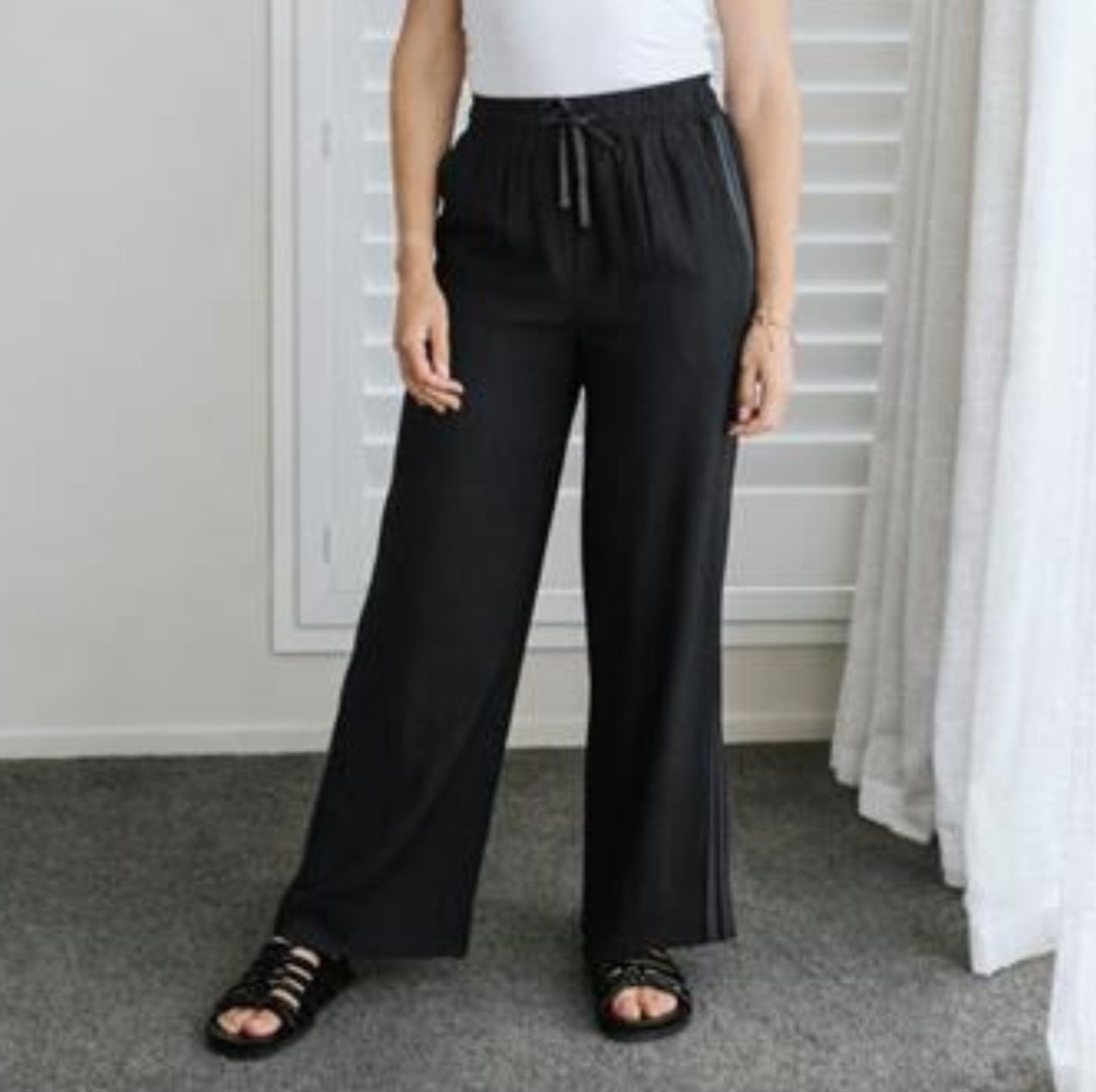 Effortless, flattering, and endlessly wearable, the Indiana Wide-Leg Pants are the perfect blend of style and comfort. Designed for modern everyday dressing, these women’s pants offer a relaxed silhouette with refined details that elevate them beyond a classic wide-leg style. Crafted from a lightweight, breathable fabrication, the Indiana Pants are designed to keep you cool and comfortable across seasons. The fluid wide-leg cut moves beautifully with the body, offering ease and polish whether you’re on the go or dressing up for an occasion. Chic black contrast stripes running down each leg add a contemporary, sport-luxe edge, while subtle side splits at the hem introduce movement and an effortlessly modern finish. Thoughtfully designed to flatter, these pants balance comfort with style in a way that feels both current and timeless. Versatile by design, the Indiana Wide-Leg Pants can be styled up with a blouse and heels or kept casual with a tee and sandals. From relaxed brunches to evenings out, they’re a wardrobe staple you’ll reach for time and time again. Designed in New Zealand. Made for women living life across New Zealand and Australia.