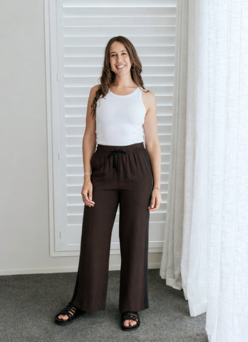 Introducing the INDIANNA Pants from Moke. These Dark Chocolate pants are an effortless wardrobe staple that combine relaxed ease with a refined, minimalist finish.