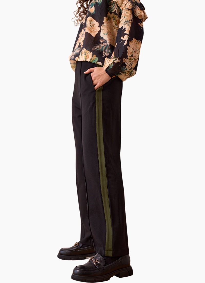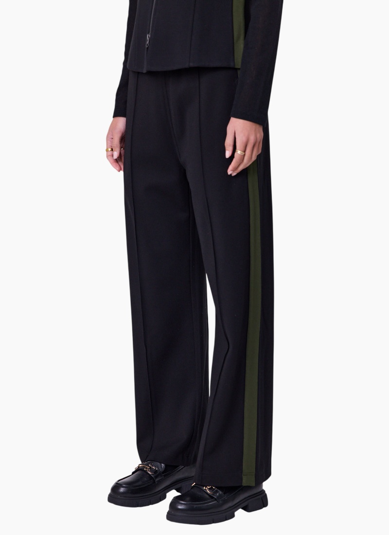 - Sleek black pants with an olive side stripe adding subtle contrast and modern detail