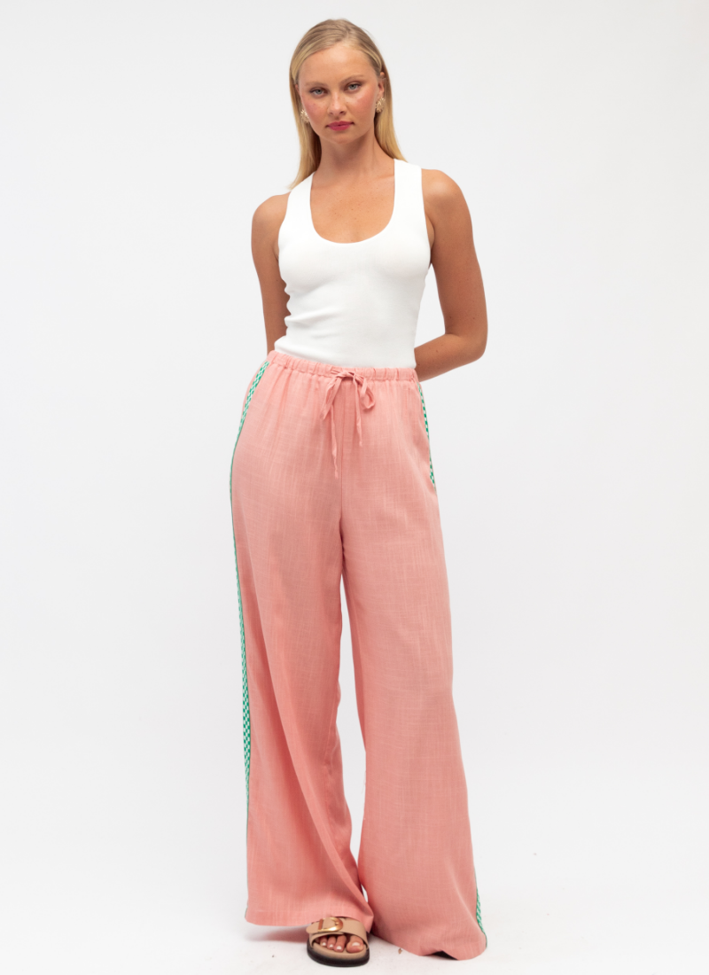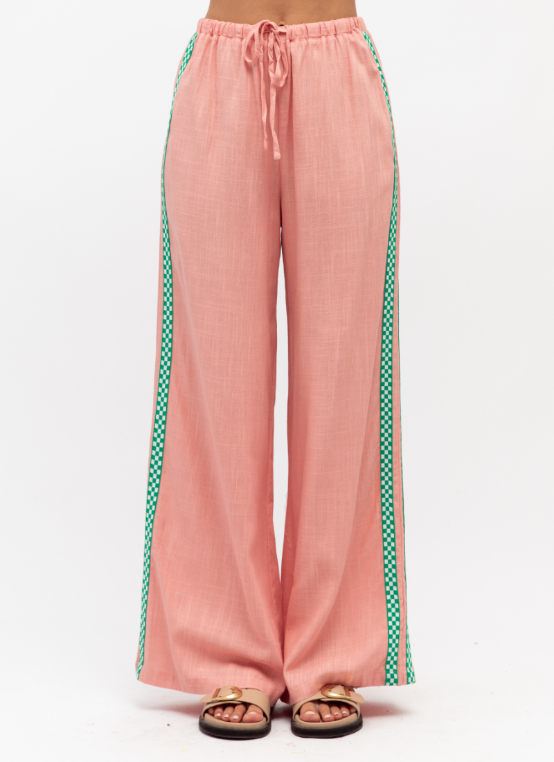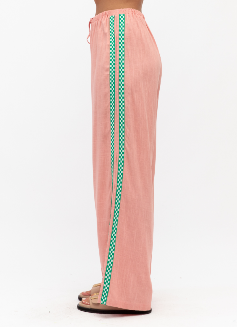 Introducing the Paper Heart Everyday Pants PINK/GREEN. This effortless pair brings relaxed, feminine charm to your wardrobe with a soft pink hue and playful green side trim.