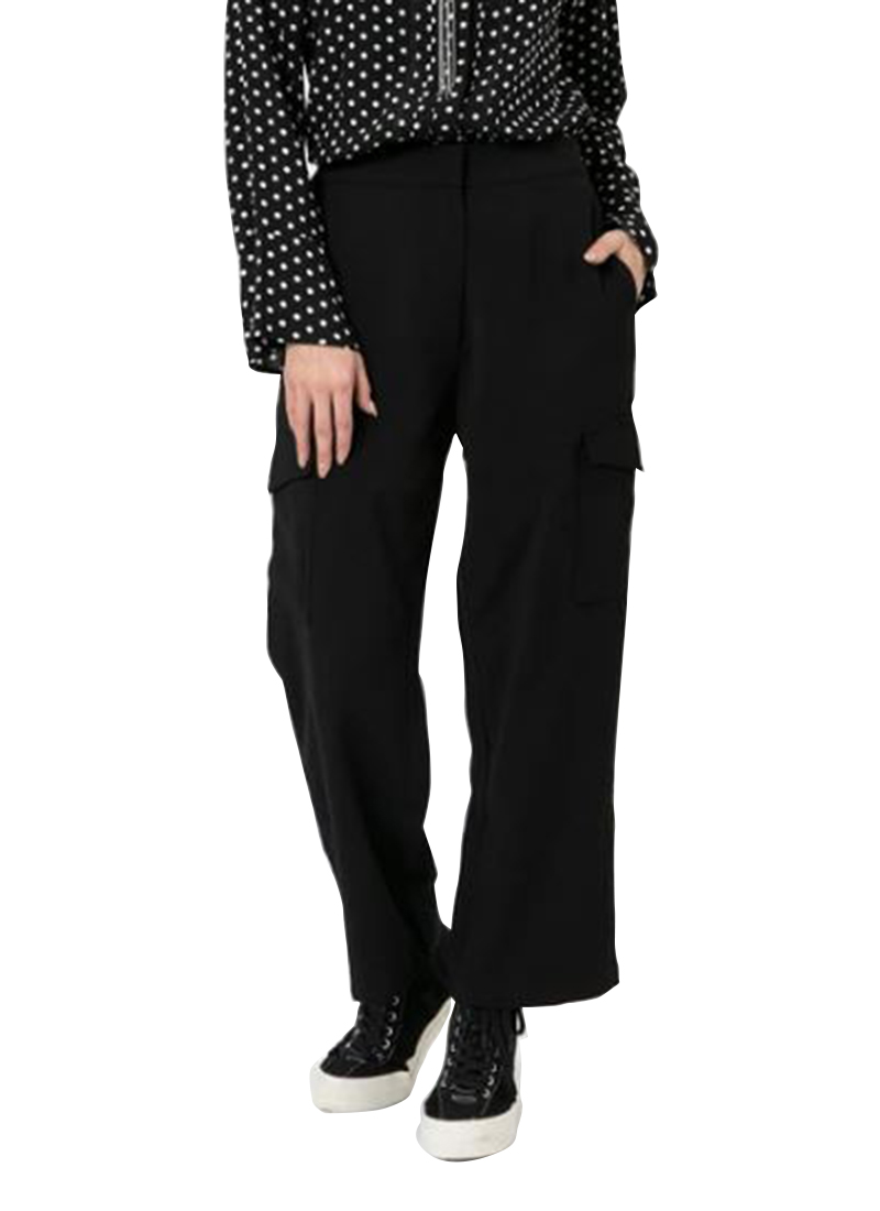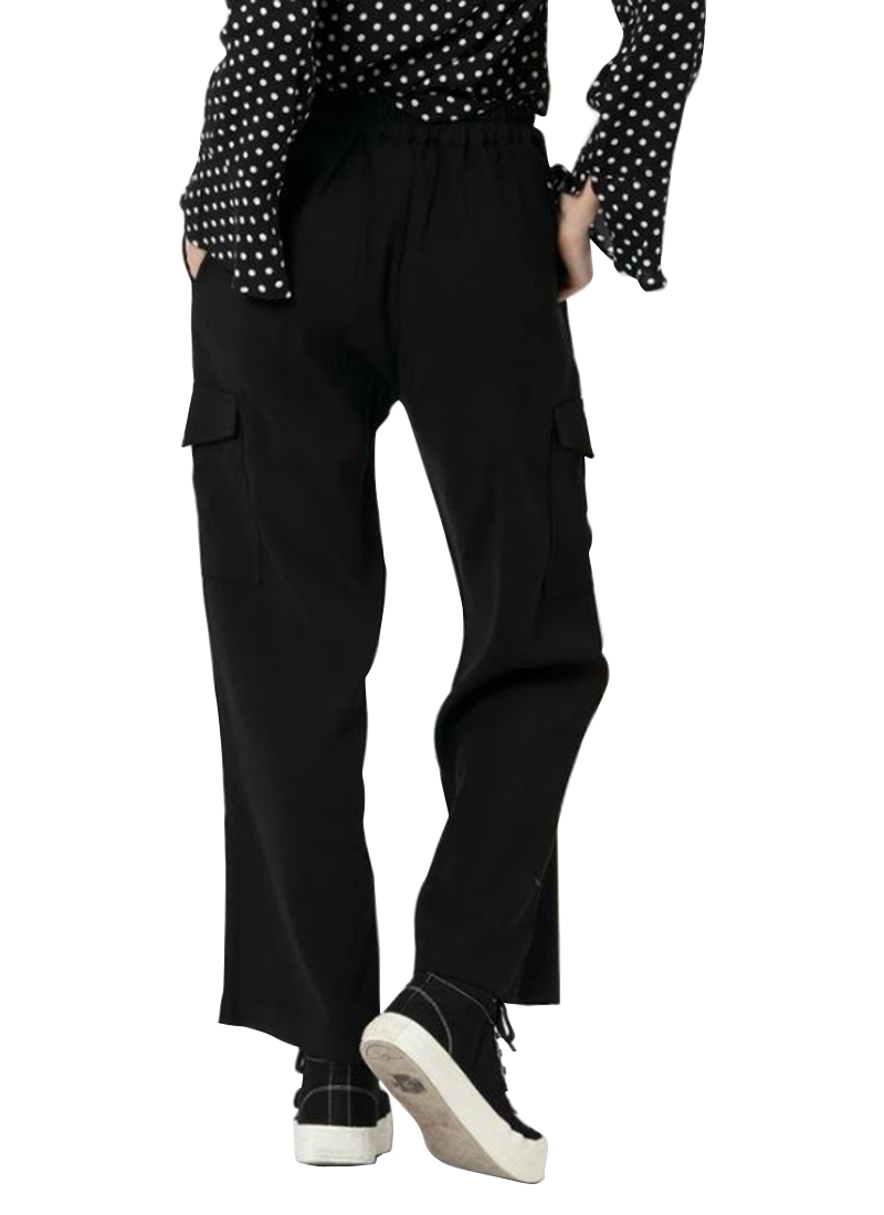 The 'Mars Trousers' are a wide leg style with elasticated back waistband for easy fit. This style has insert pockets at the waistband and patch pockets with flaps on the sides. The trousers are made in black crepe with heavy topstitching detailing.
